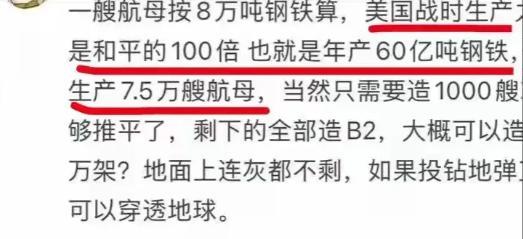 公知说美国战时可以造7.5万艘航母,在一年内,因为战时的生产力是和平时期的100倍,一年可以生产60亿吨钢铁,所以折算一年可以生产7.5万艘航母,但是美国只要生产1000艘航母就可以了,剩下生产B2,可以生产上万架B2,可以把地球炸地灰都不剩,钻地弹可以穿透地球! 公知这套说辞,听着就像把科幻片当纪录片讲。美国一年造7.5万艘航母?这账算得连小学生都得摇头。 尼米兹级航母光甲板钢就得上万吨,全身零件超过10亿个,纽波特纽斯造船厂拼尽全力,一年也就能交一艘。真要造7.5万艘,得把美国所有造船厂连锅端了再扩大一千倍,连纽约港的码头都得改成船坞,可能吗? 钢铁产量这事儿更经不起扒。美国2023年的钢铁总产量才8500万吨,就算战时能翻番,撑死1.7亿吨,离60亿吨差着三十多个跟头。 全球一年的钢铁产量加起来也就20亿吨,美国想独吞三倍还多,怕是得把月球上的铁矿都挖下来。 再说航母用的可不是普通钢筋,甲板钢得抗住30吨战机的冲击,耐压壳钢材能承受水下500米的压力,这种特种钢美国一年产能也就50万吨,够造5艘航母就不错了,7.5万艘?纯属拿嘴放炮。 B2轰炸机更不是流水线能攒出来的。每架B2的隐身涂层得手工喷涂,光这道工序就耗三个月,全球能做这活儿的技师不超过200人。 美国巅峰时期一年也就造2架,现在生产线早拆了,想重开至少得五年。上万架?把波音和洛克希德·马丁的工程师全绑在车间里,这辈子也造不完。更别说B2每飞一小时就得花30万美元维护,上万架光保养费就能把美国军费掏空,这账公知怕是没算过。 钻地弹能穿透地球?这玩笑开得有点大。地球半径6371公里,美军最狠的GBU-57钻地弹也就打穿60米混凝土,连地壳的零头都摸不着。真要钻透地球,得用比核武器还猛的能量,先不说技术上不可能,真这么干,地球都得抖三抖,美国自己先没了,图啥? 这些离谱说法,本质上是把“战时潜力”当魔法用。二战时美国造得最疯,四年也就攒了155艘航母,其中117艘还是护航航母,吨位不及现在的十分之一。 那会儿美国有1.8亿人口,现在3.3亿,但产业工人比当年少了60%,很多造船技术都断代了。去年美国想修艘两栖攻击舰,结果发现能焊特种钢的工人就剩7个,还都快退休了。 真要比工业底子,中国现在一年造船完工量占全球40%,钢铁产量是美国的10倍,光特种钢产能就够一年造20艘航母。 但没人会说这种疯话,因为懂行的都知道,战争拼的是体系不是数字。公知这套说辞,说白了就是拿无知当论据,把幻想当现实,也就骗骗没见过工业生产线的人。 战场上的输赢,从来不是靠嘴炮轰出来的。美国要是真按公知说的这么干,先得把自己的工业体系拆了重造,还得请个魔法师来帮忙。不然别说7.5万艘航母,能把现役的11艘保养好,别天天趴港里生锈,就谢天谢地了。