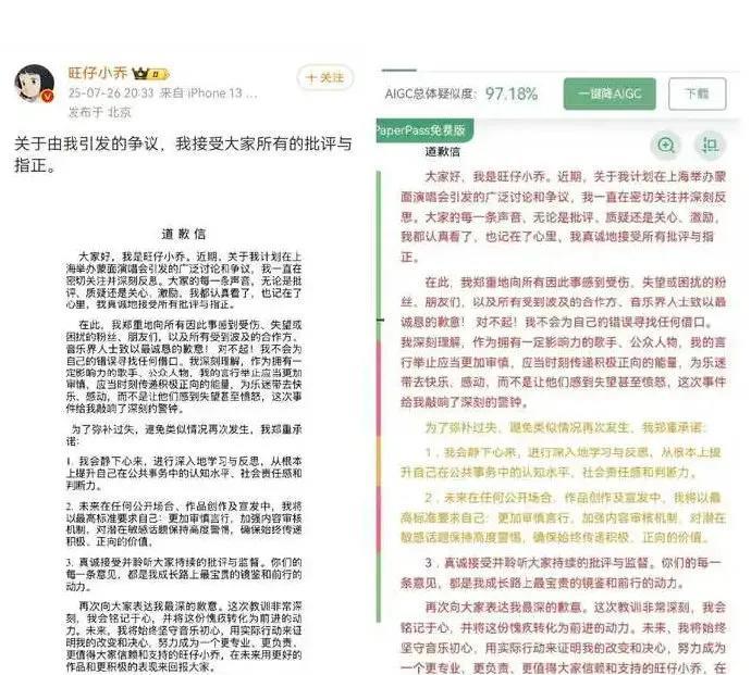 近日,网红歌手旺仔小乔因蒙面演唱会引发了巨大争议,在发布道歉信之后,又因查重率被疑高达97%,再度被推到风口浪尖。 7月26日,旺仔小乔发布道歉信,表示对于计划举办蒙面演唱会所引发的广泛讨论和争议,自己一直在密切关注并深刻反思。她宣称“真诚接受所有批评与指正”,还承诺会“加强内容审核”、“确保始终传递积极、正向的价值”。 随后,网友利用检测工具发现道歉信的查重率高达97.18%,并调侃道“难道就原创了一个自己的名字?” 旺仔小乔原计划于8月9日举办2025“探寻者”演唱会。演出计划采用不露脸的形式,票价在268元至968元之间。该消息一经发布就引发了部分网友的不满,争议主要集中在票价、演唱形式以及原创作品占比等方面。 7月26日,旺仔小乔演唱会的主办方发布延期公告,称由于艺人身体原因,无法配合原定演唱会相关的舞台内容设计和需求,无法保证最佳表演效果,经多方审慎评估后,旺仔小乔2025“探寻者”演唱会 - 上海站延期。