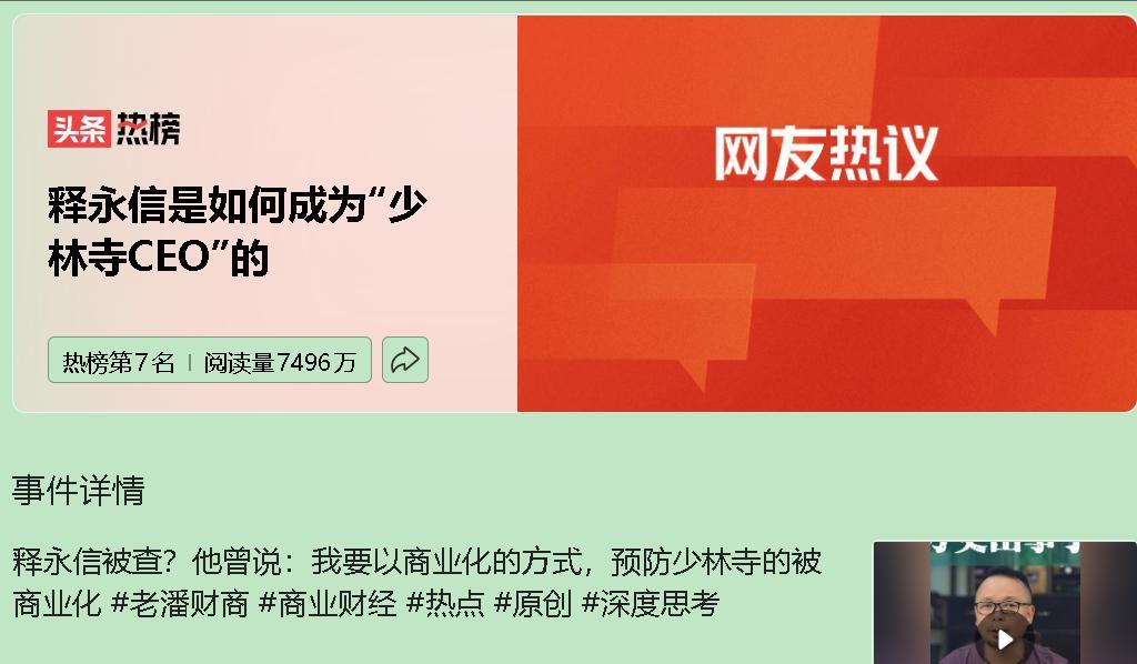 释永信的“少林寺CEO”之路从1987年接管破败古刹开始,靠着商业头脑打造了一个横跨文旅、地产、电商的宗教商业帝国。他的商业版图扩张包括品牌垄断、资本抓手和流量变现。他注册了706项商标,甚至包括食品、珠宝等离谱品类,靠诉讼维权发家。2008年,他成立少林资管公司,个人持股80%,主导4.52亿郑州购地引发争议。流量变现方面,淘宝店年销2300万,抖音直播单场破500万,海外武巡演每场收入50万美元。#释永信是如何成为“少林寺CEO”的# 然而,释永信的人设崩塌关键在于财务黑洞、性戒沦陷和权力寄生。他自称月薪700元,却被曝穿16万袈裟、持豪车;寺院年收入超3亿却从未公开审计。2015年弟子释延鲁举报其私生活混乱、有私生女,当时官方辟谣,如今通报实锤“多名女性+私生子”。他借寺院资产孵化私人资本链,少林资管投资16家公司中13家已注销,疑涉利益腾挪。 这本质上是宗教资本化失控的恶果。监管真空让千年古刹沦为“流量工厂”,烧香变逛商场,开光成带货噱头。戒律失守暴露信仰空心化,方丈涉刑事犯罪重创佛教公信力。警方已辟谣“携34人潜逃美国”,但多部门联合调查预示案件深度。若挪用资金坐实,刑责难逃。而私生子丑闻,已让“高僧”滤镜碎成渣。如今,释永信的“商业帝国”还能撑多久?他的未来又将如何?这些都成为了人们关注的焦点。#少林寺官网已删除多篇涉释永信文章##释永信曾用4.5亿元拍地进军房地产#