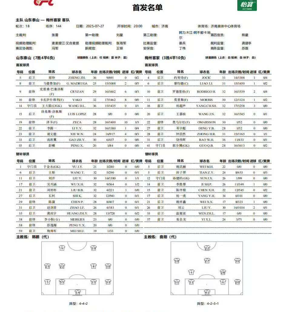 泰山首发:刘洋终于被拿下,不想赢都难 克雷桑换发型:从头开始(从水雷开始) 新外援登场:谨防伤病,应该不会让打满全场,石柯随时准备替他上场 进球3个以上:泽卡1,克雷桑2,瓦科1,谢文能1(进5球) 再一个看点,连续12轮被破门,今天能否0封,要不然尴尬将持续。