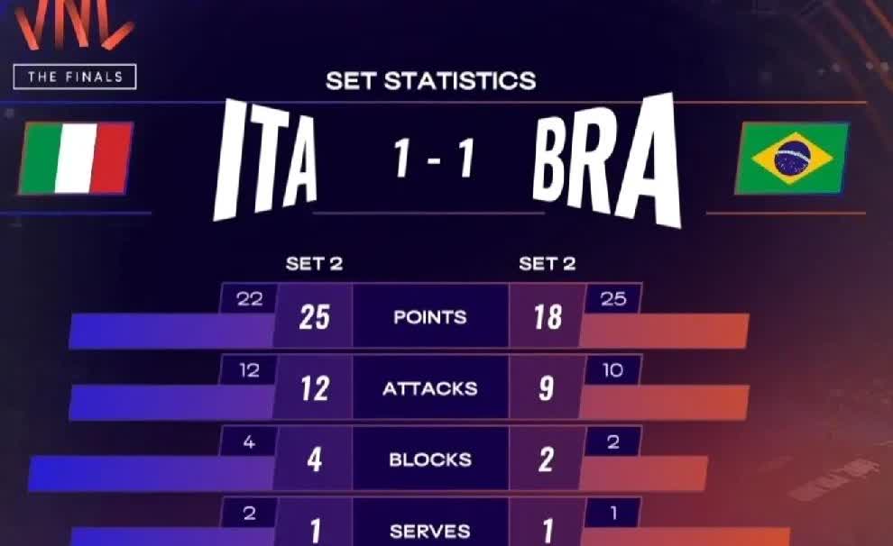 女排世联赛总决赛金牌战,意大利女排第二局25-18胜巴西女排,前两局大比分1-1平! 第二局巴西女排打的有点像中国女排对阵波兰女排那场球,不给副攻球,2号位接应也没球,打成了4号位主攻一点攻,和吴梦洁被拦一样,加比也屡屡被拦[不看] 意大利女排拦网只盯着4号位就行了,巴西女排主攻下球太难了[不看]