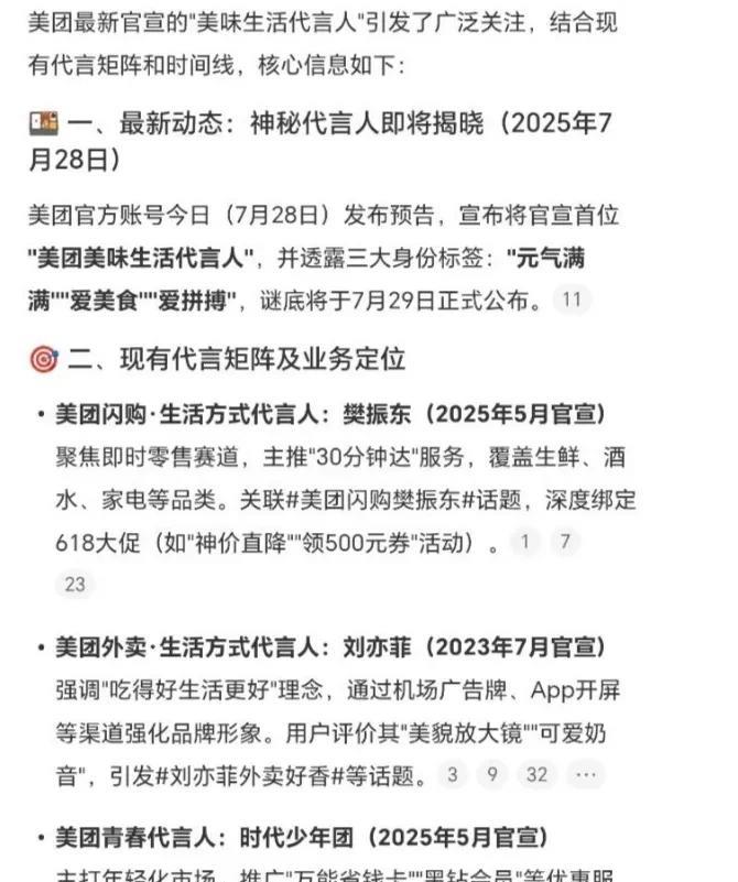 实话实说,美团是真有眼光又选莎莎做代言啦? 图一,莎莎的这个朦胧身影太有辨识度了,不用看就知道是莎莎。 给美团代言品宣的明星很多,还有小胖樊振东,给莎莎的分类是美团美味生活代言人 不知莎莎这个美团代言的含金量能超过其他明星吗?