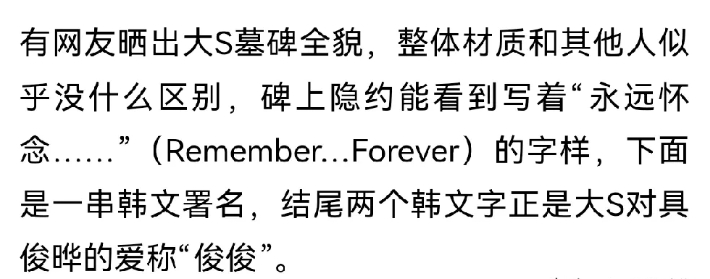 看到大S的墓碑刻文,汪小菲能气晕! 台媒报,网友金宝山偶遇具俊晔在守墓,照片曝光,具俊晔就这么坐在大S墓地旁边,大S墓碑全貌一览无余,能看到墓碑刻的是英文,有网友说,意思是“永远怀念……”