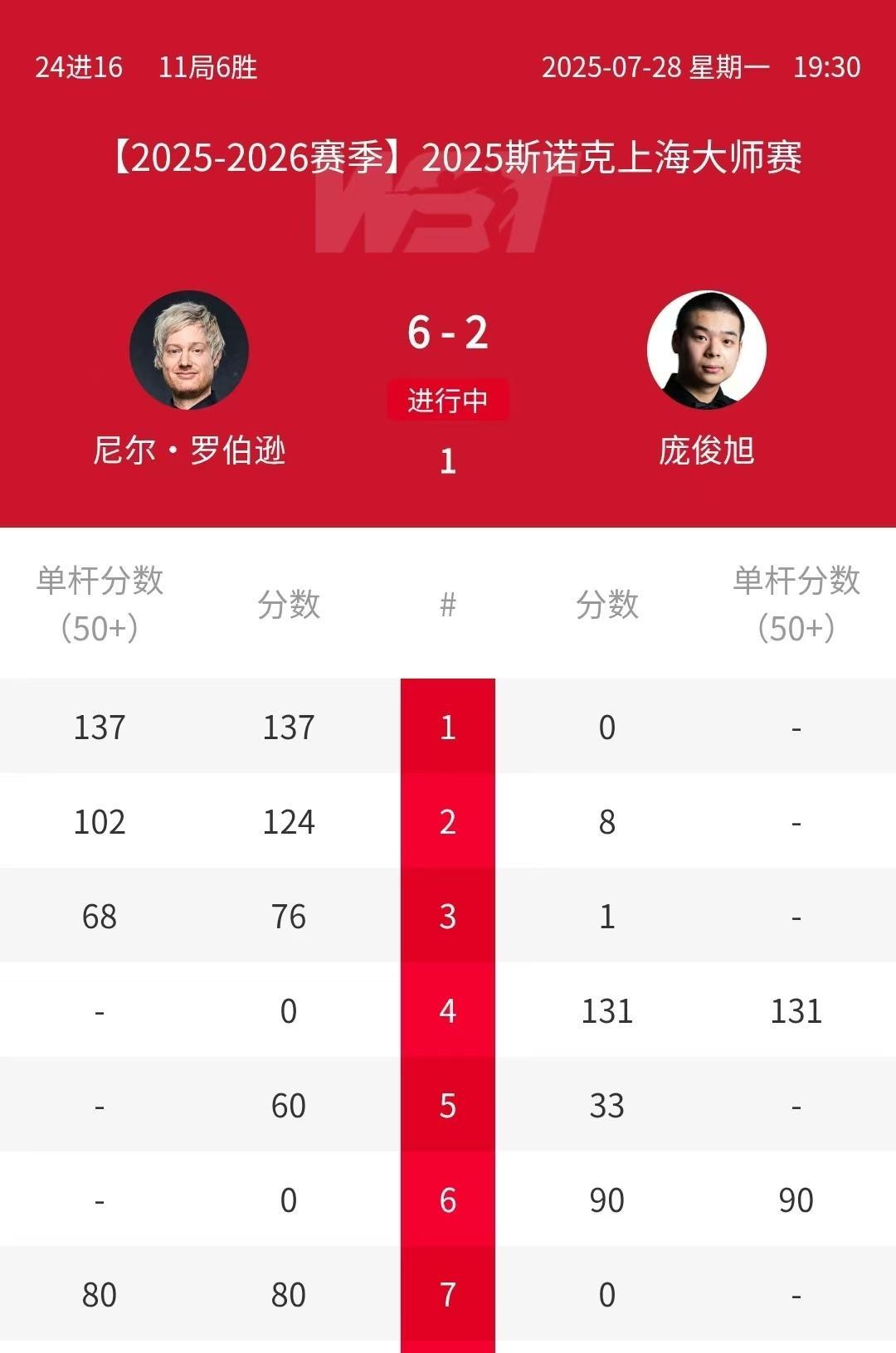 庞俊旭2:6不敌尼尔-罗伯逊,止步上海大师赛首轮。这么简单的一个斯诺克,连续三杆解不到球。很明显趴着有些够不着,还不主动改变一下,直到要被超分了才去拿一个加长把,对待比赛的态度有问题。今天出战的中国球员,除了内战以外其他全部都输了。斯诺克被对手做的头昏脑胀,解球和防守的差距都太明显了,应该还是这方面训练的质量不够。