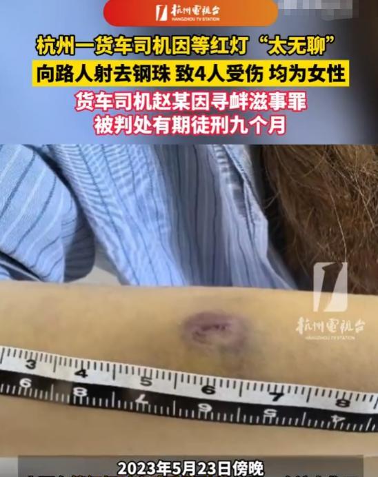 “坏到骨子里了!”浙江货车司机等红灯闲得无聊,就用弹弓专挑漂亮女路人打钢珠玩,结果短短几天伤到四人。民警找到司机后,他一脸委屈地说:“我就是等红灯太无聊,想找点乐子,不是故意要伤人的。” 7月28日报道,杭州货车司机赵某因寻衅滋事罪,被判处有期徒刑9个月,至于说起赵某到底干了什么,至今他都觉得自己有点“冤枉”。 赵某是一个跑大车的司机,每天很长时间都在车上待着,日复一日的工作让赵某觉得非常乏味。可是赵某又是一个非常喜欢玩的人,所以在车里他就给自己找了不少“玩具”,其中就有一个弹弓,没有活的时候,赵某都会拿着弹弓去打打鸟,打打花花草草解解闷。 赵某用的不是什么石头,而是专门从网上买的钢珠,因为钢珠的威力大,赵某非常享受命中之后物品炸开的感觉。2023年5月23日,赵某开车实在是无聊的不行,等红灯的时候,他突然一回头就看到放在副驾驶的弹弓和钢珠了。 他看到自己的前方有一个长得十分不错的女生,所以就起了恶作剧的心理。赵某就这样偷偷的朝着女生打了一下,女生吃痛的尖叫,四处张望想要寻找凶手。可是赵某此时已经开心的开着货车逃离了现场。 赵某不知道的是,钢珠打到了女生的手臂,手臂被打出了一个深坑,正在往外面乎乎的冒血。女生的朋友也在附近找到了钢珠,随后就报了警。 5月28日,赵某在等红绿灯的时候被警方抓获,从他副驾驶的座位底下,发现了作案工具。赵某虽然承认了自己行为,但是他并不觉得自己触犯了法律。因为他只是闲得无聊,想找点乐子,他不过是在开玩笑,整点恶作剧罢了,没有听说搞恶作剧还会被判刑的。 赵某说弹弓和钢珠是2023年在网上买的。在5月23日、24日、27日,他朝人群发射了6枚钢珠,其中的4枚刚好伤到了4名女路人,路人的受伤情况也各有不同。交警就将此事的严重性系数告知,赵某也意识到了自己的行为有多么的过分。他承认错误,并对受害的家属进行赔偿,获得了谅解。 对此,你怎么看呢?欢迎在下方评论~