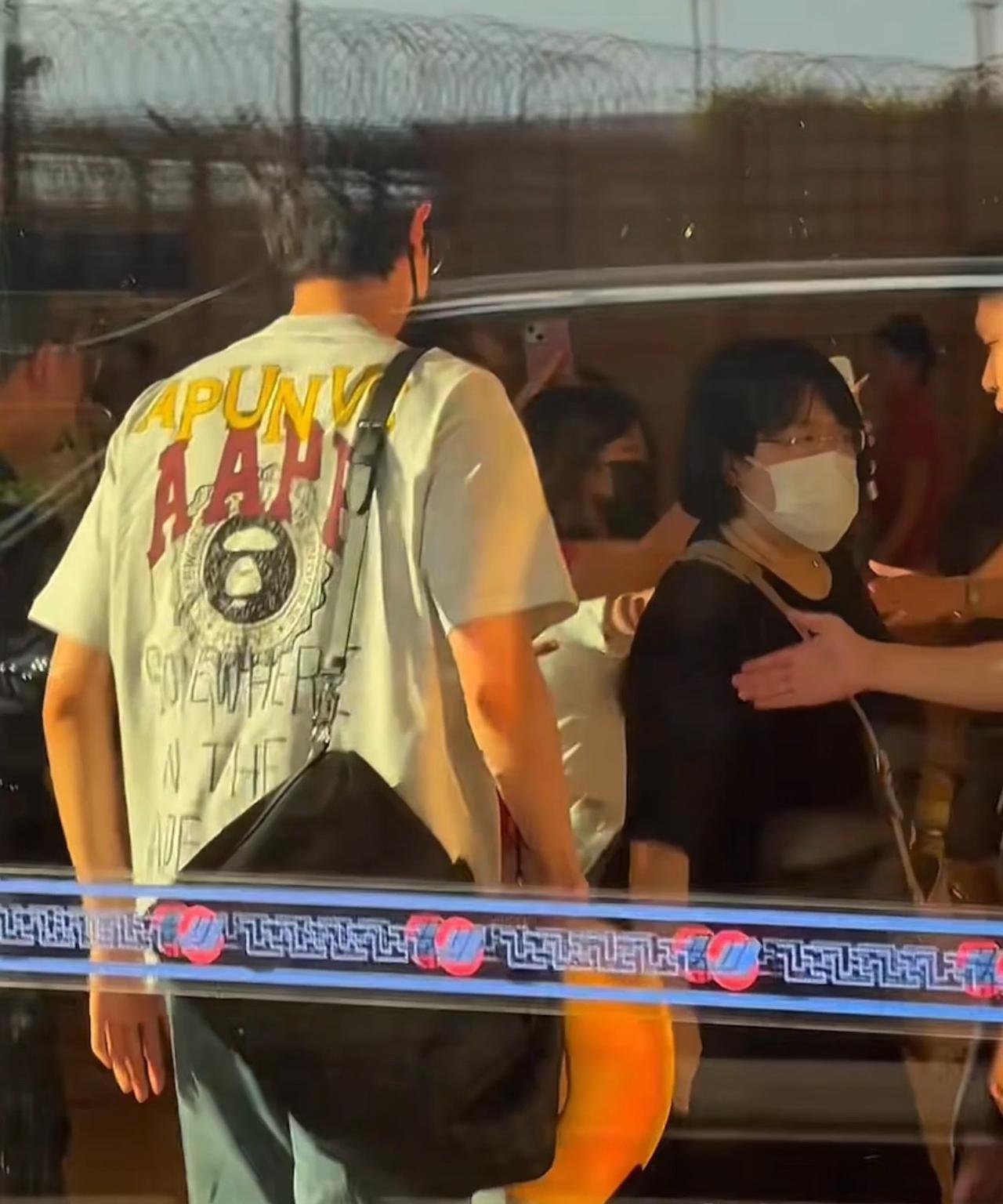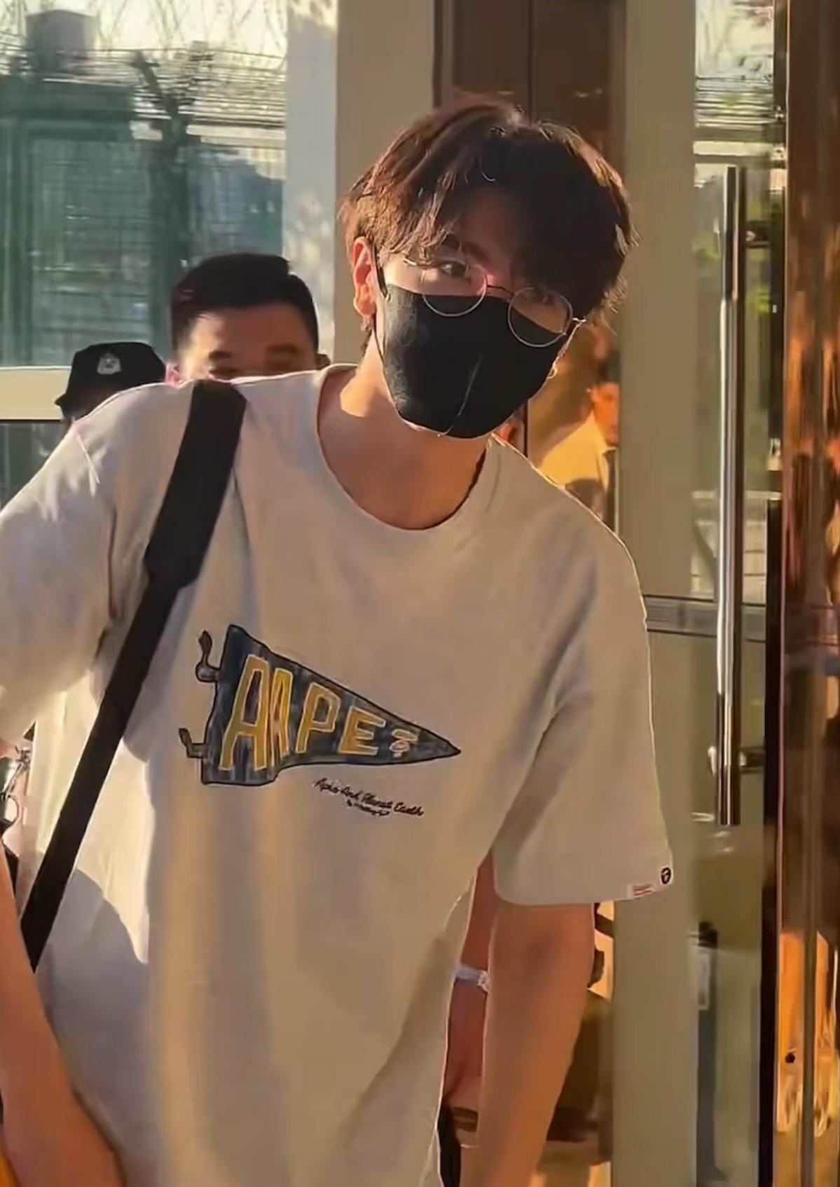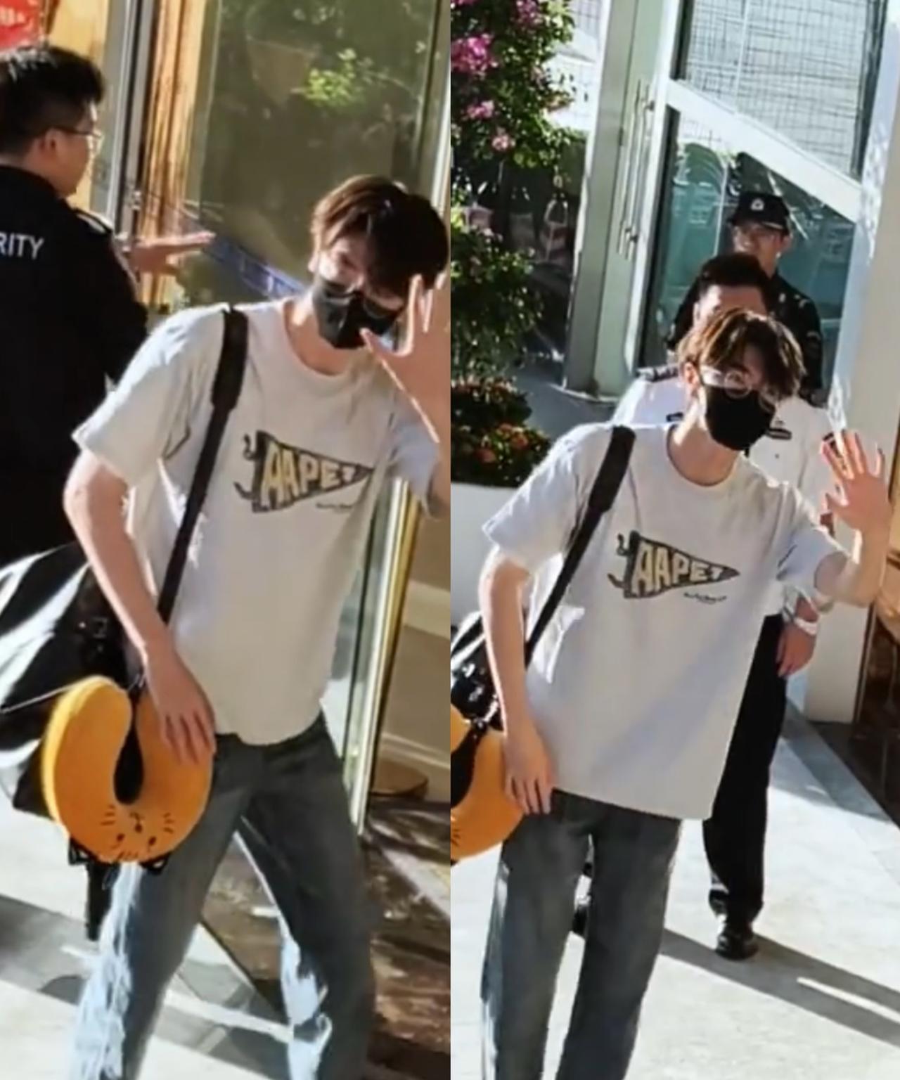 林一厦门飞北京,大男孩比心好有爱。林一7.28厦门出发,穿灰色T恤搭配牛仔裤,简