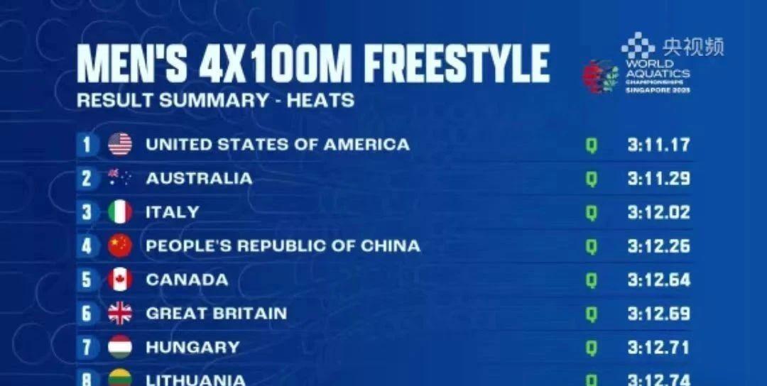 47秒73!100自接力:潘展乐从第4追到第2! 就在刚刚,游泳世锦赛男子4x100自接力预赛结束,潘展乐再次展现“超”能力,从第四名追到第二名,中国队顺利晋级决赛。这场男子4×100米自由泳接力预赛,由陈俊儿、王浩宇、刘吴狄、潘展乐组成。从第一棒起,澳大利亚就开始。中国队的第二棒是王浩宇,澳大利亚则派出棒强棒朱利安尼,这是巴黎奥运会时的出场选手,不过王皓宇游出了47秒59,堪称惊喜。第三棒,澳大利亚扩大领先优势,潘展乐接棒前暂列第四,然后就进入潘展乐个人能力的发挥,转身前追上一位,最后一个转身过后,中国队处于第三的排位,澳大利亚第一。最后时刻,潘展乐上升到第三,几乎是比赛的最后时刻又上升一位,最终中国队3分12秒26的成绩完赛,澳大利亚队在今天这场预赛当中,游出了3分11秒29的成绩,这组的竞争确实要激烈很多,澳大利亚队打开了3分11秒区域,中国队排名小组第2,总排名则是第4。尽管潘展乐从第4追到第2,但分段成绩未游进47秒,名列队内第2,决赛加油!#2025游泳世锦赛男子4x100自接力预赛#潘展乐#体育实事新闻#体育热点#体育赛事