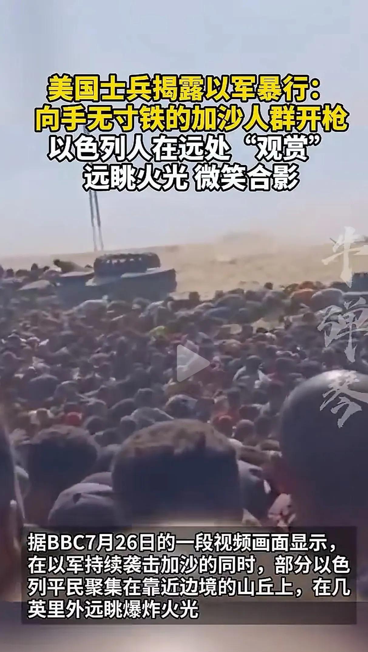 一名参加过加沙行动的美国士兵揭露以军暴行:他们向手无寸铁的加沙人群开枪,他从未见过如此暴行;以色列人在远处通过望远镜观赏远眺火光,犹如在围观一场表演,还有人拿出手机微笑拍照留念。——BBC7月26日报道。