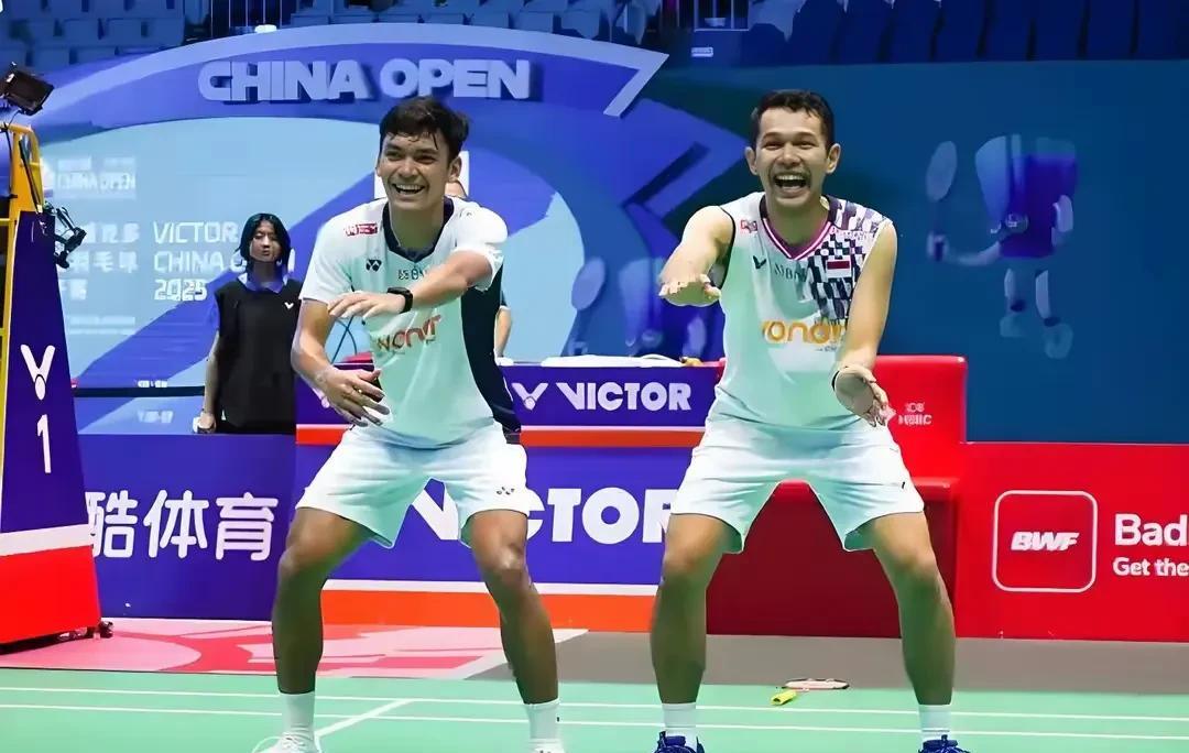印尼的男双临时搭档阿尔菲安和菲克里在中国羽毛球公开赛连克塔曼/伊斯法哈尼、金元浩