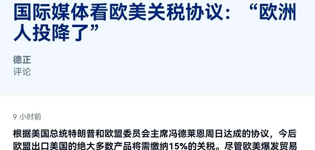 德国媒体不高兴了!来自德国媒体7月28日消息说,欧盟和美国签署了所谓的协议,但这