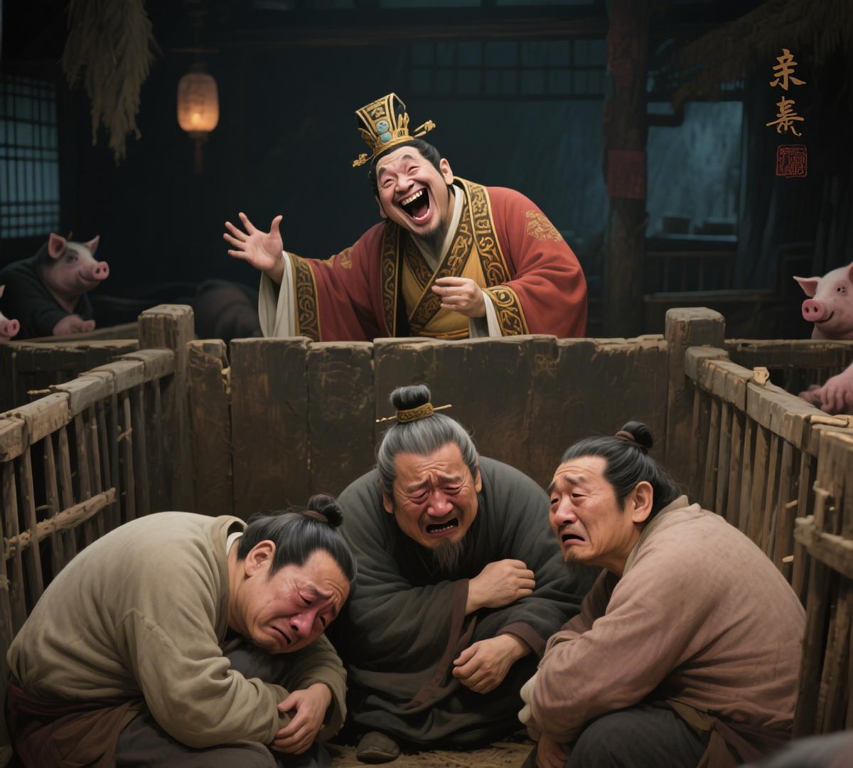 皇帝拿着猪食瓢,笑眯眯地看着猪圈里的“猪王”:“叔叔,快趁热吃,今天的饲料加了