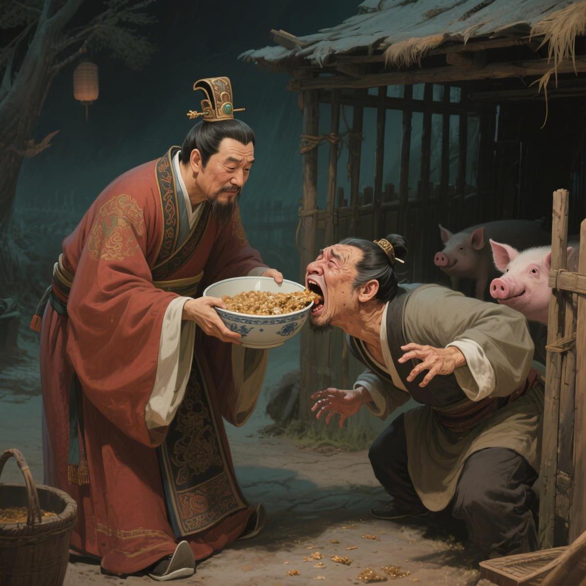 皇帝拿着猪食瓢,笑眯眯地看着猪圈里的“猪王”:“叔叔,快趁热吃,今天的饲料加了