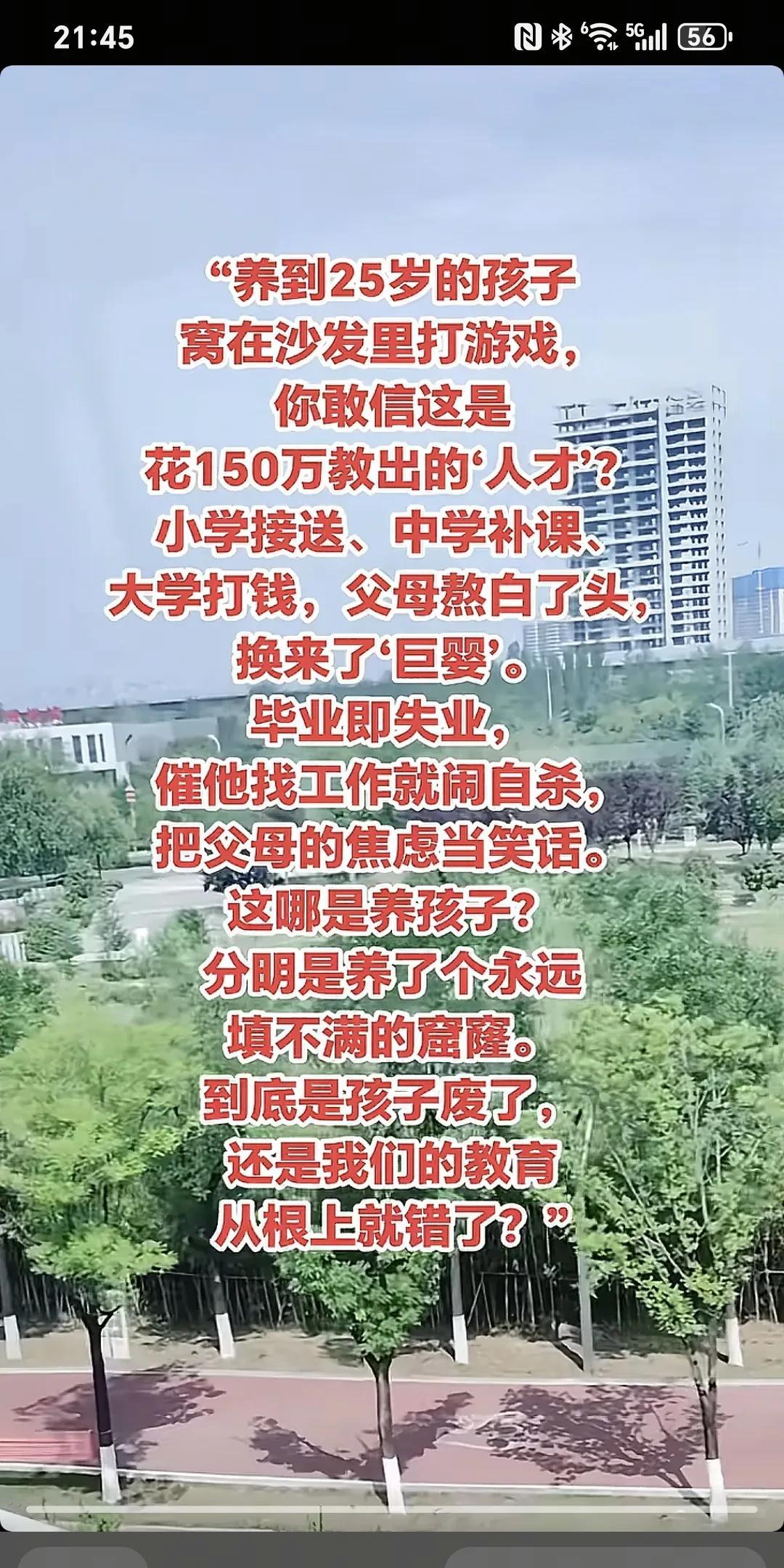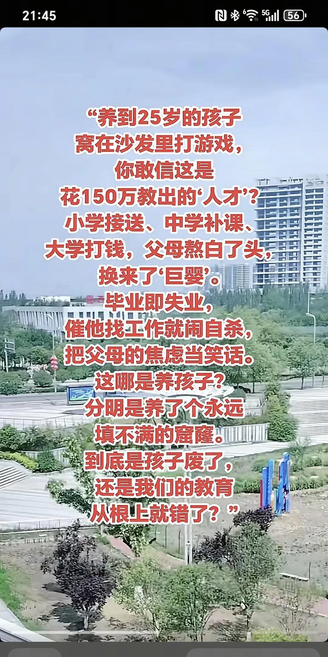 养到25岁的孩子,窝在沙发里打游戏,你敢相信这是花150万教育出来的“人才?”小学接送,中学补课,大学打钱,父母熬白了头,换来了“巨婴。”毕业即失业,催他找工作就闹自杀,把父母的焦虑当笑话,这哪是养孩子,分明是养了个永远填不满的窟窿。到底是孩子废了,还是我们的教育从根上就错了。 我认为还是孩子个人的认知问题,自古以来富裕和贫穷的家庭都有上进和懒惰的孩子,认知底的孩子怎么教都是犟驴,好话听不进,坏的东西秒吸收,认知高的孩子不怎么教都会出淤泥而不染! 教育的失败!父母也糊涂,一直在给孩子“添砖加瓦”,其实他早已不是孩子了,你们让他不会独立 从小培养孩子心理素质,品格历练,吃苦耐劳,干家务,理解父母,一句话,从小培养孩子,做人做事,这真的很重要[祈祷][祈祷][祈祷]#大龄孩子躺平# #巨婴式子女# #养子女困境#