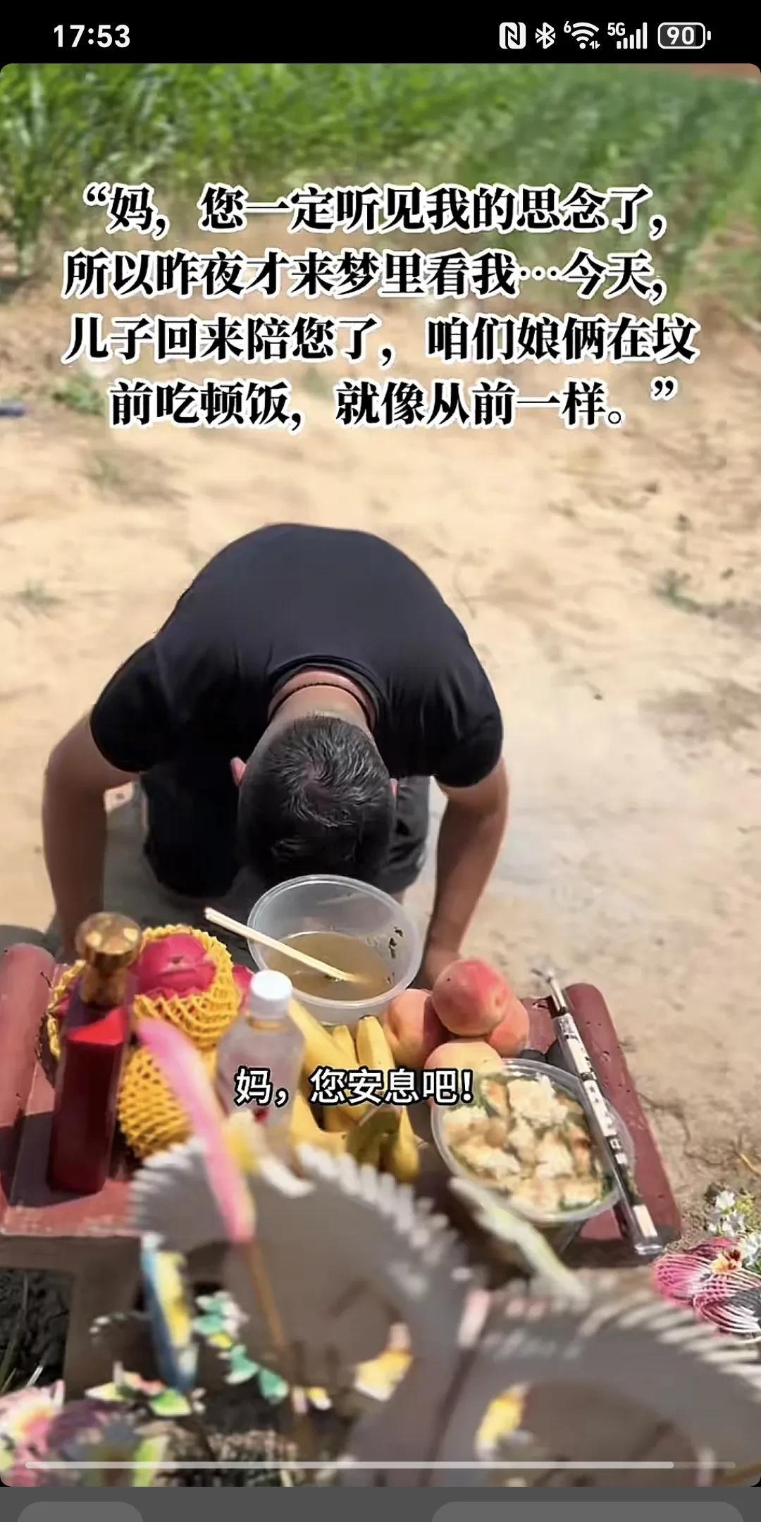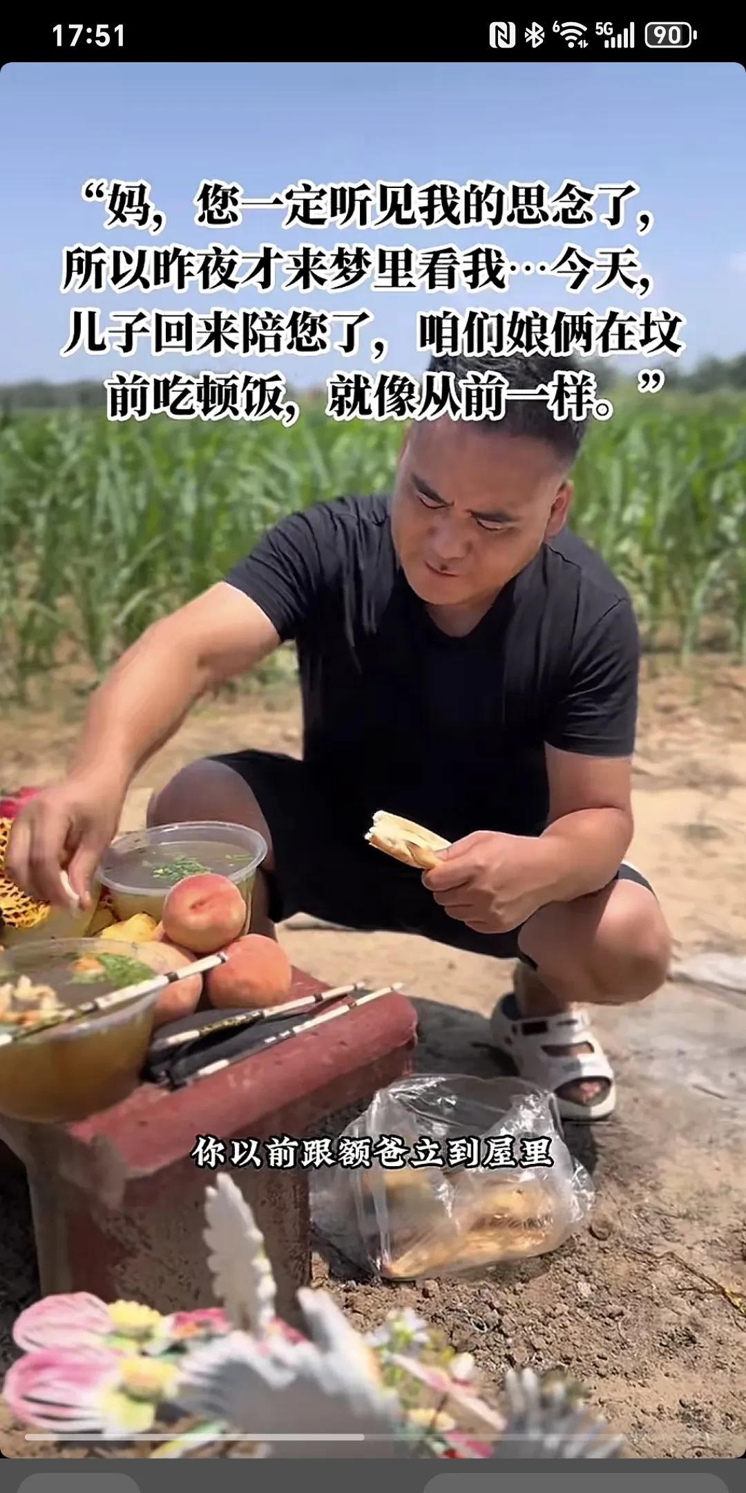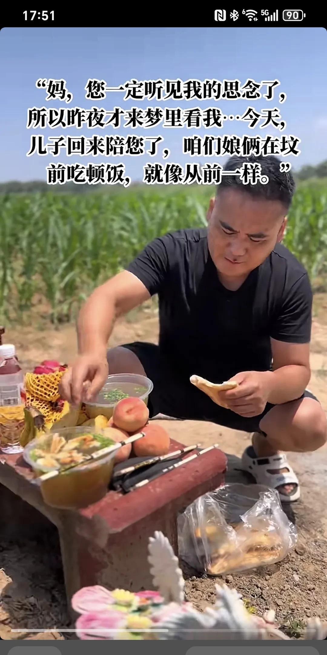 妈,你一定听见我的思念了,所以昨夜才来梦里来看我...今天,儿子回来陪你了,咱俩娘们在坟前吃顿饭,就像从前一样~ 妈,你娃来看你来了,你想你娃了。 我回来专门看你,我早上起来把啥事一安排,回来专门陪你吃个饭,儿子以前经常忙,知道你爱吃羊肉泡,跟我爸一天呆在家里舍不得吃,你以前跟额爸立到屋里,额舍不得吃,舍不得喝,你儿子一天不在屋,你儿子回来了,你们吃这个吃那个,你儿子走了,你给我爸在家就是随便吃点,我知道你是舍不得,儿子回来了,就让儿子看这,你们过的好,吃的也好,你夜黑给你娃说,他梦给你娃说,你那边啥都好,我这边也过得好着呢,妈额这边也好着呢,额把爸照顾好,你那边放心,你需要啥里你给娃托梦,儿子来再给你送。此时此刻,我的手已经开始颤抖,眼泪控制不住的掉,我的心酸,我的亏欠,我的思念,最爱的您。我的心真的好痛,强忍着泪水陪你吃完早餐,妈,您安息吧!