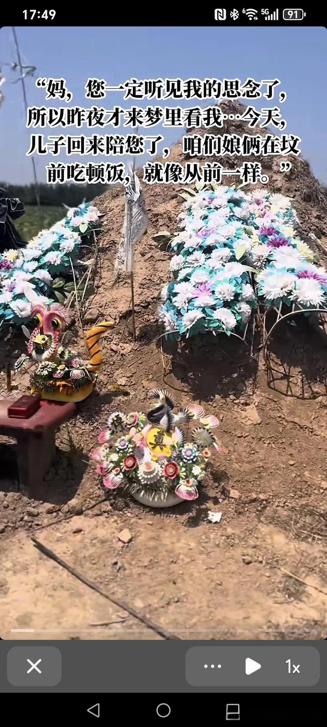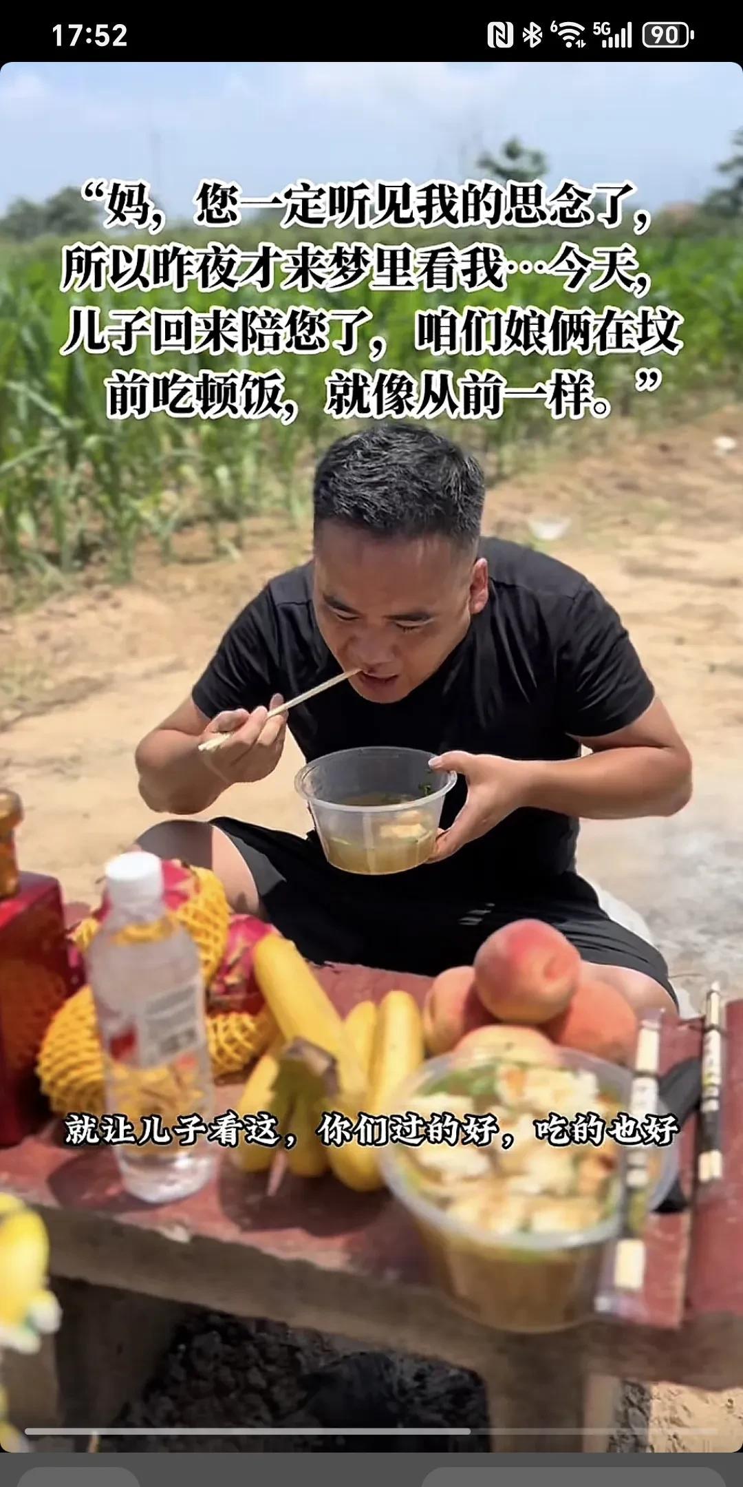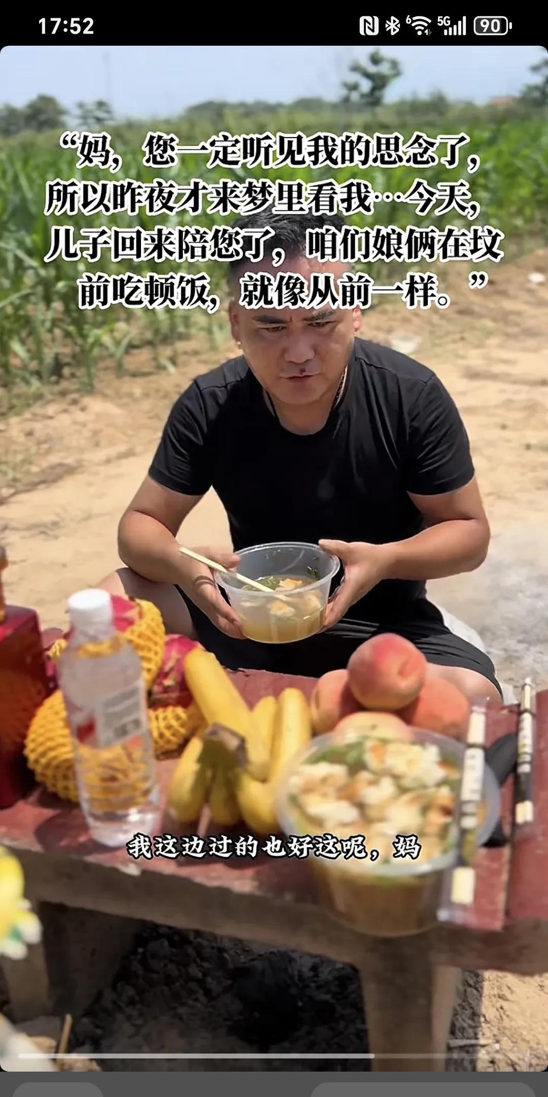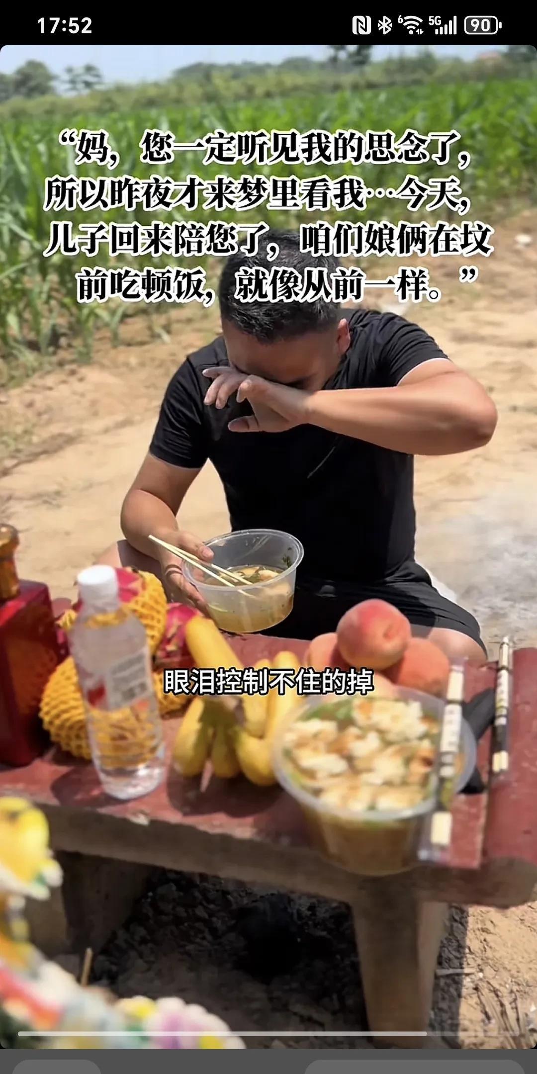 妈,你一定听见我的思念了,所以昨夜才来梦里来看我...今天,儿子回来陪你了,咱俩娘们在坟前吃顿饭,就像从前一样~ 妈,你娃来看你来了,你想你娃了。 我回来专门看你,我早上起来把啥事一安排,回来专门陪你吃个饭,儿子以前经常忙,知道你爱吃羊肉泡,跟我爸一天呆在家里舍不得吃,你以前跟额爸立到屋里,额舍不得吃,舍不得喝,你儿子一天不在屋,你儿子回来了,你们吃这个吃那个,你儿子走了,你给我爸在家就是随便吃点,我知道你是舍不得,儿子回来了,就让儿子看这,你们过的好,吃的也好,你夜黑给你娃说,他梦给你娃说,你那边啥都好,我这边也过得好着呢,妈额这边也好着呢,额把爸照顾好,你那边放心,你需要啥里你给娃托梦,儿子来再给你送。此时此刻,我的手已经开始颤抖,眼泪控制不住的掉,我的心酸,我的亏欠,我的思念,最爱的您。我的心真的好痛,强忍着泪水陪你吃完早餐,妈,您安息吧!