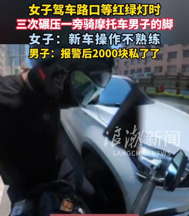 这种人应该吊销驾照!天津,一男子骑摩托在路口等红灯,突然旁边一辆白色私家车进入同一个车道,甚至前后三次碾了男子的脚,可当男子上前理论,女司机却反过来质疑为什么要把脚放在那里! 视频显示,男子先骑车来到路口,紧接着女司机就开车进入同一车道,而且紧紧贴着摩托车,男子被压脚后,反应相当激烈,立刻用手拍打车子,让女子倒车 男子当场疼得够呛,连忙拍打车窗让她倒车,结果女司机愣是反问他——“你脚怎么放那儿?”这话一出口,气得围观群众都觉得她这是明目张胆地甩锅。更离谱的是,她还因为操作不熟练,在男子提醒她倒车后,又补了一脚。一共三次碾脚 医生说拍片没骨折,但软组织明显肿胀,走路都费劲。最后俩人协商了一下,女司机赔了2000块钱,算是私了了事。男子没再继续追责 说实话,新手司机不是借口。谁都是从新手过来的,但马路上不是练车场,既然握着方向盘就得对别人负责。压到东西第一反应不应该是继续往前开,这点常识都没有,真该回驾校重新学科目一。现在路上这种马路杀手太多了,变道不打灯,停车不看镜,出事了就装无辜 最气人的是女司机那态度。压了别人脚不赶紧道歉,反倒质问人家为什么把脚放那儿 我觉得,有些人不在乎规则,只图一时方便,什么变道、超车、乱并线全靠感觉。这种人,压根不是不会开车,而是根本不配开车 #女子驾车等红灯时三次碾压男子的脚#