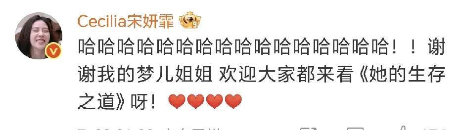 沈梦辰为宋妍霏新作品打CALL! 确实在这部新作品里,宋妍霏的表现有了更大的进步。 CC宝在评论区留言回复:“…谢谢我的梦儿…” 有兴趣的朋友们可以去看看《她的生存之道》,还不错。从演员表看就知道不用担心作品的演技问题。