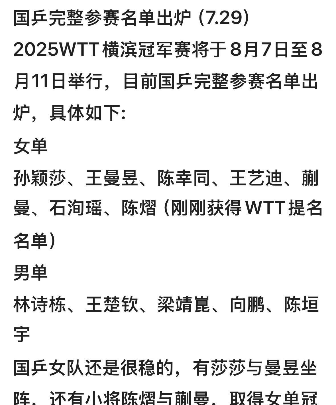 WTT横滨冠军赛外卡和提名:黄镇廷陈熠桥本帆乃香女线乱了 7月29日,世界