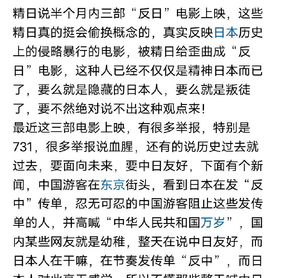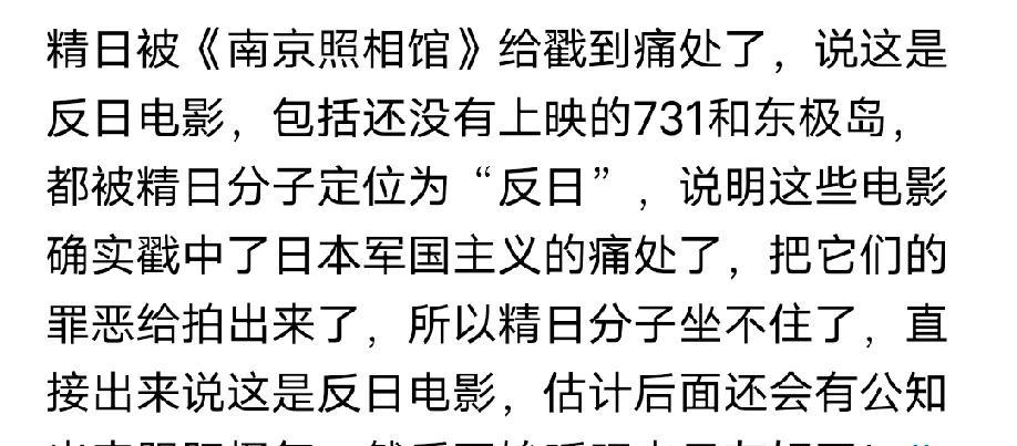 网友说侵略者就是侵略者,不要自作多情地去挖掘侵略者身上的人性闪光点;受害者就是受害者,不要莫名其妙让无辜受害者背上反思的枷锁,那就不讲理!南京照相馆的导演和编剧悟透这个道理了,才能拍出大家都认同的电影! 确实是这样的,以前有些导演拍这种题材的电影,表面上在拍那段历史,但是总给人一种怪怪的感觉,这个网友就说出了其中的缘由,有些隐藏地很深的导演或者编剧,就是借拍这种题材的电影夹带私货,跟某些国外得大奖的作家一样,说日本兵眉清目秀,还有人性的闪光点,其实这样的导演编剧或者作家都不是什么好人!