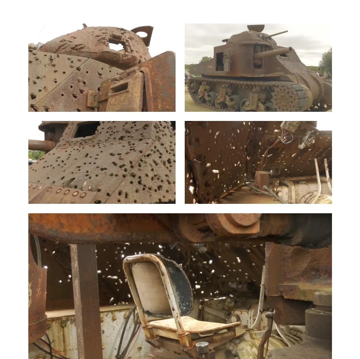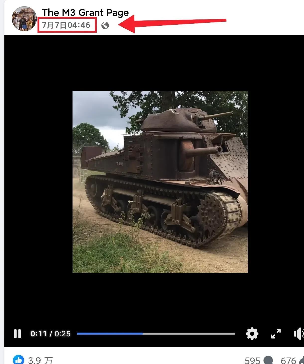 这都有人信啊? 真相是:二战时期美国坦克,1941年首批抵达英国的M3 Grant T24193。 这辆T24193号坦克是1941年首批抵 达英国的M3格兰特坦克之一。它曾 用于越野和炮击试验,后来在战争后 期被用作靶场靶。坦克主人很贴心地 分享了一些它在被打捞出来之前的照片。 这辆坦克于2003年从萨里郡的皮尔 布赖特靶场打捞出来,并进行了机械 修复,但其外部损伤将被保留,以直 观的方式展现其作为靶场靶的历史。 据坦克主人称,这辆M3坦克曾用于 测试缴获的德国“铁拳”和“坦克怪”, 坦克身上被”坦克怪”击中,留下了约 100个直径10毫米的弹孔,以及近 400个直径12-13毫米的“铁拳”弹孔。 此外,似乎还有更大的弹孔,可能是 一些HESH弹的损伤,以及大量的轻 武器击中或剥落痕迹(图四)。 坦克博物馆介绍:“这辆M3·格兰特被约翰·吉尔曼上校和卡尔·布朗发现,并由C&C军方修复。这是世界上最古老的运行中的美国中型坦克,也是英国获得的第一批赠款。 在第二次世界大战期间,它被广泛用于射击、装载和自动跟踪,特别是在皮尔布赖特靶场对抗德国反坦克武器。它有494个洞。在20世纪70年代,它被重新用于帮助ATDU开发Chobham armour,成为英国服务中的第一笔也是最后一笔拨款。 这辆坦克官方页面(图五)发布的视频是7月7日(图六),而泰柬7月24日冲突。 类似这样杜撰的假消息还真不少,上一篇还是柬埔寨出动老爷机米格21去打泰国(文章底下有链接)。这类消息第一个编造者为了流量真是煞费苦心添油加醋,其他人不懂跟着瞎转发就有点蠢了,明知道假的还转发那就有点坏了。