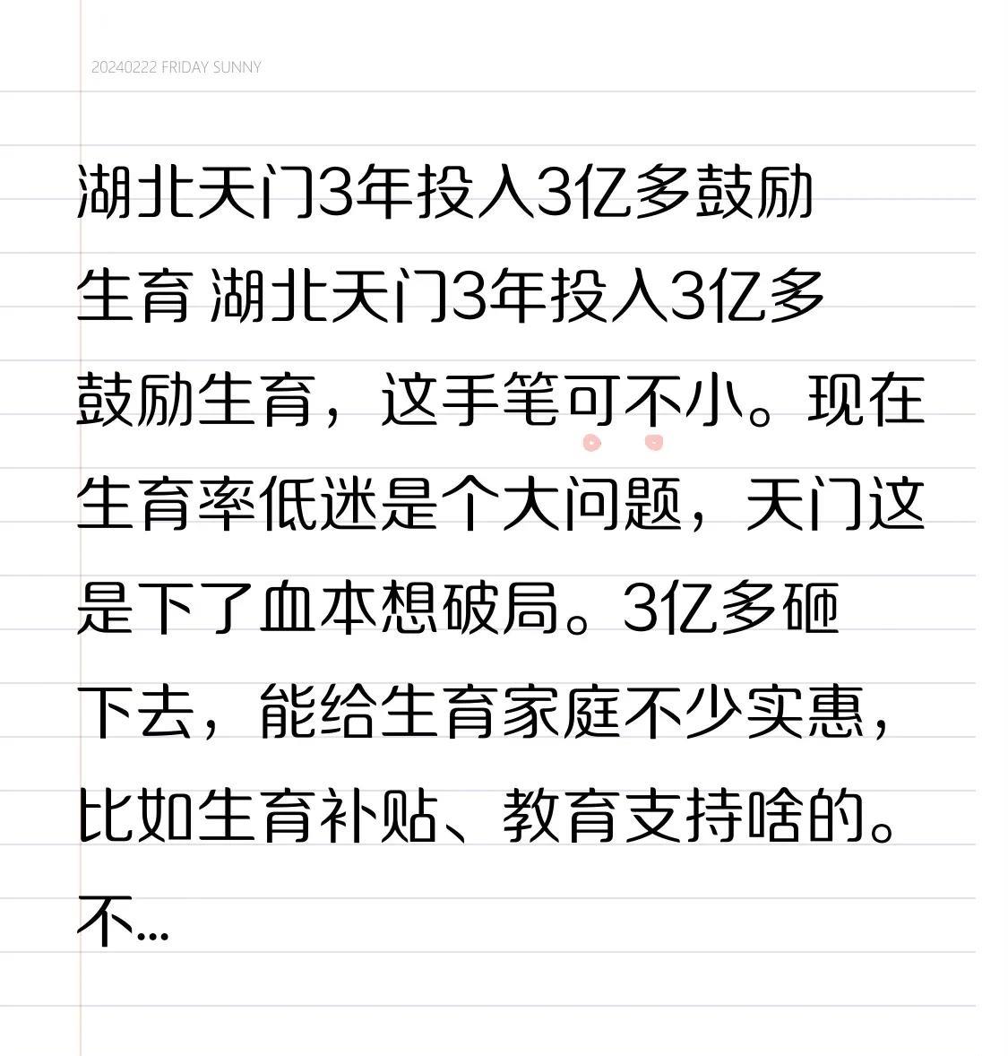 湖北天门3年投入3亿多鼓励生育湖北天门在3年里投入了3亿多来鼓励生育呢,这投入