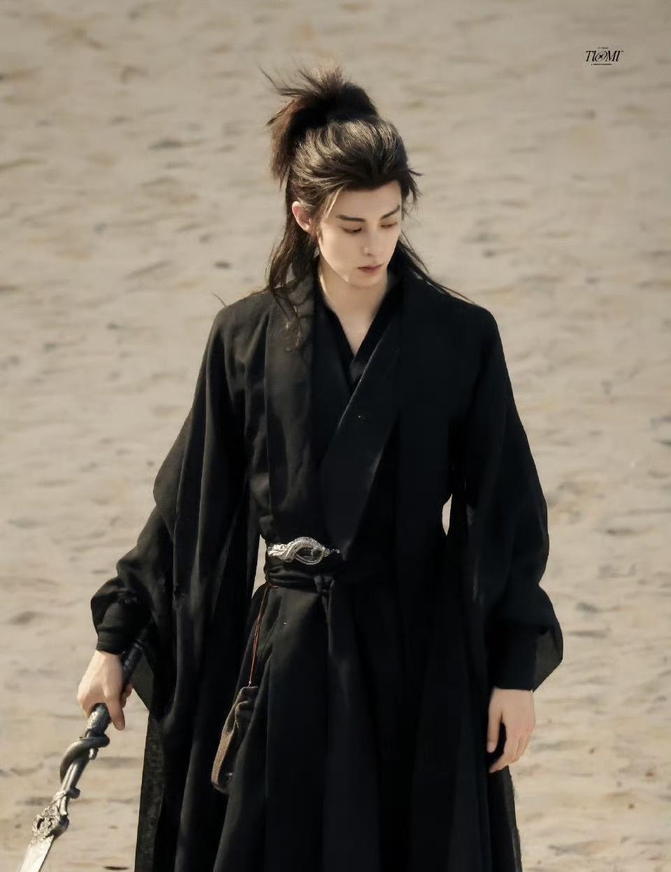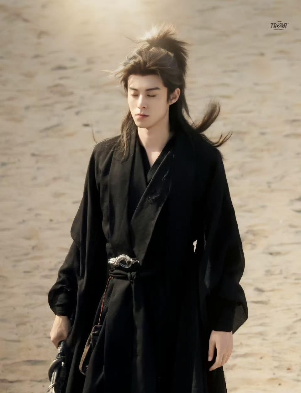 王鹤棣今天《咸鱼飞升》的造型来了,高束发髻,黑衣广袖,手持利刃的宋潜机英气十足,