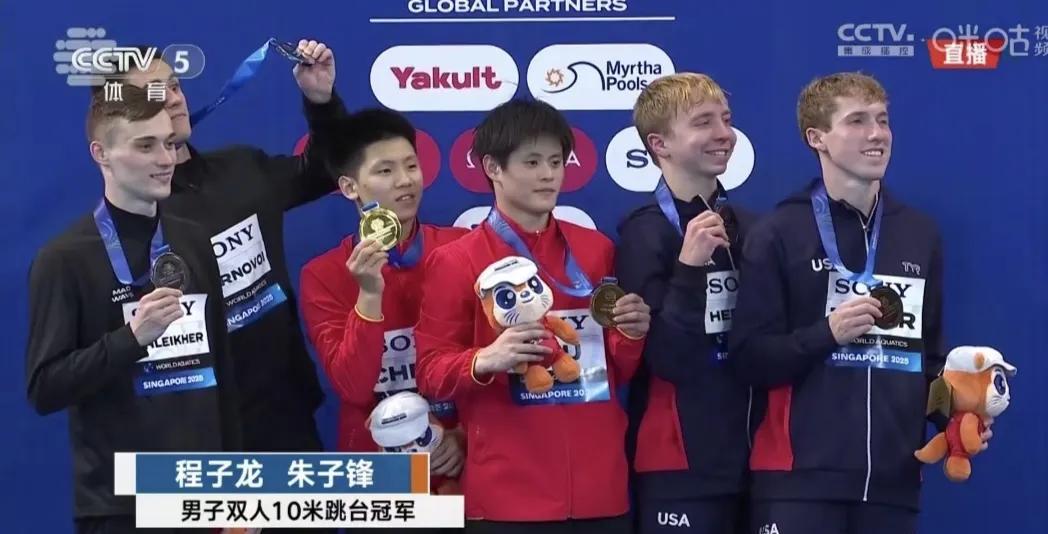 从炸鱼到逆袭!0.93分!程子龙/朱子锋虎口夺金 7月29日下午,世锦赛跳水项目第四个比赛日,进行男子双人10米台决赛。 预赛,中国组合程子龙/朱子锋以总分423.33分排名第一,晋级决赛。中立选手组合和英国组合排名第二、第三,成绩分别为407.91分和394.86分。 决赛共八组选手出场,六轮比赛。前两轮为规定动作,后四轮为自选动作。中国组合每轮最后一个出场。 第一轮,包括中国组合在内,三个组合均跳出52.20分。 第二轮,中国组合跳出53.40分,总分105.60分,比并列第二总分103.20分高出2.40分。 第三轮,自选动作开始。中立选手组合发挥出色,跳出84.66分的高分,总分187.86分。中国组合还以颜色,跳出85.44分,总分191.04分,高出3.18分。 第四轮,中国组合出现重大失误,入水“炸鱼”,仅得60.18分,总分251.22分,名次一下子掉到第三。前两名分别是总分272.10分的中立选手组合、总分255.60分的日本组合。 第五轮,中国组合跳出87.69分,总分338.91分,升至第二。中立选手组合跳出79.92分,总分352.02分。中国组合仍落后13.11分。 第六轮,也就是最后一轮。中立选手组合发挥一般,跳出76.68分,总分428.70分。中国组合顶住巨大压力,发挥极为出色,跳出全场最高分90.72分,总分429.63分,一跳逆袭,夺得金牌。 从“惊人炸鱼”到“满血复活”,程子龙/朱子锋一波三折,创造奇迹。 这是中国跳水梦之队的第七枚金牌。