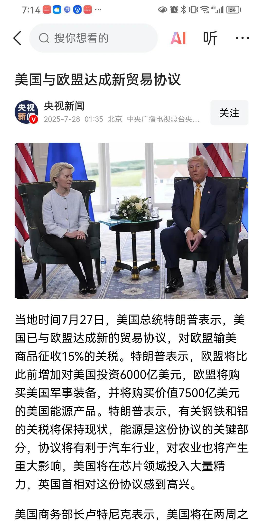 匈牙利总理欧尔班炮轰欧美贸易协议, 称特朗普将冯德莱恩当早餐吃掉了。 法国极右翼领袖玛丽娜·勒庞称欧盟惨败,欧洲议会国际贸易委员会主席贝恩德·朗格批评是欧盟单方面屈服。 欧盟用13000亿美元没有得到美国的恩赐,还是要征欧洲商品15%的关税,在美国人眼里,欧盟是上不了餐桌,只能上菜单,所以被美国宰割了一回又一回。这个世界上,能上餐桌的只有中美俄三个国家。