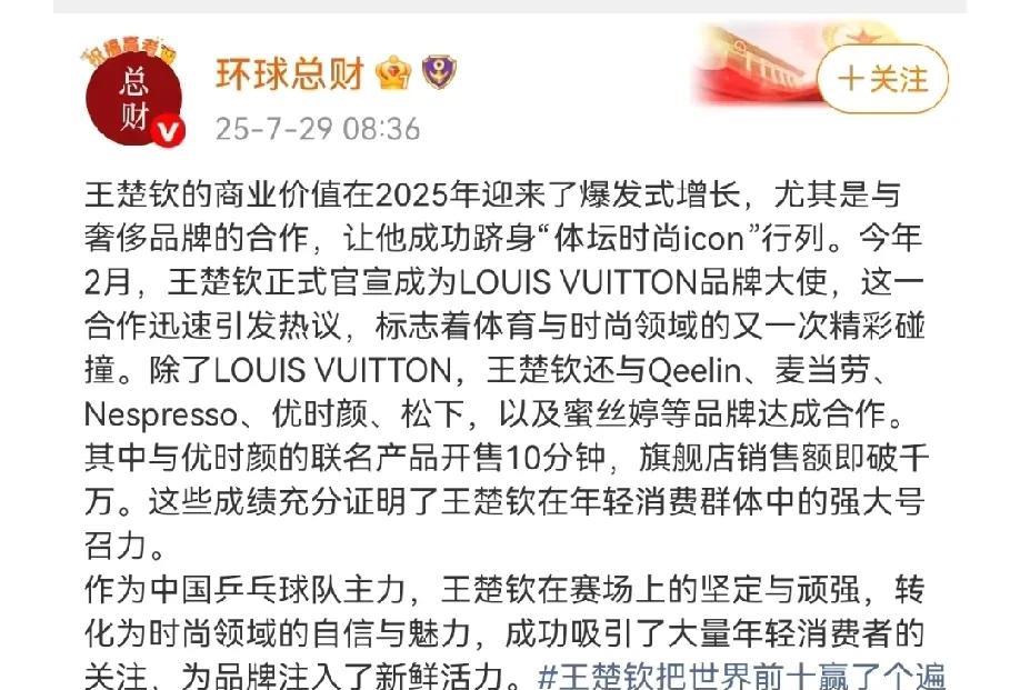 王楚钦的价值不仅仅是代言了这个那个品牌,也不止是代言了奢牌。 一年前民报对他的采