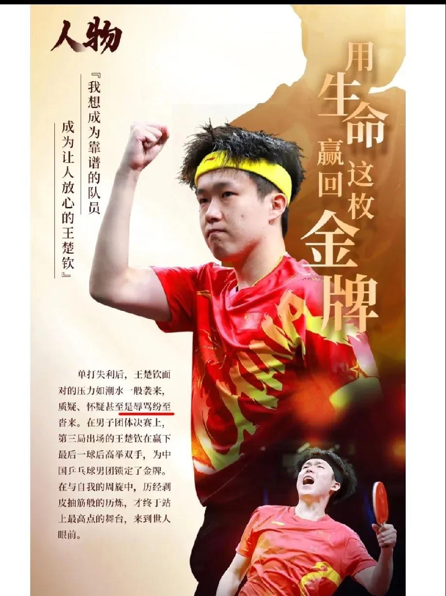 王楚钦的价值不仅仅是代言了这个那个品牌,也不止是代言了奢牌。 一年前民报对他的采访中有提及他单打失利后各种不好的网络行为。 在大部分人不看好他,怎么打怎么输,觉得用口水就能毁了他时,他慢慢站起来了。 站起来的不止是他一个人,还有中国乒乓球队,和对乒乓的热爱。 唯有热爱,才能让人永不言弃,唯有热爱,才能化压力为动力,唯有热爱,才能抵挡一切流言蜚语。 靠自己,在球场上重新找回自己的价值。 他的坚毅与自信,担当与责任,终将变成强大的力量,影响越来越多的人。所遭遇的失败,也会变成强大的盔甲,在未来的道路上一路护航。这才是他不可替代的价值。 #赛场雄狮王楚钦#