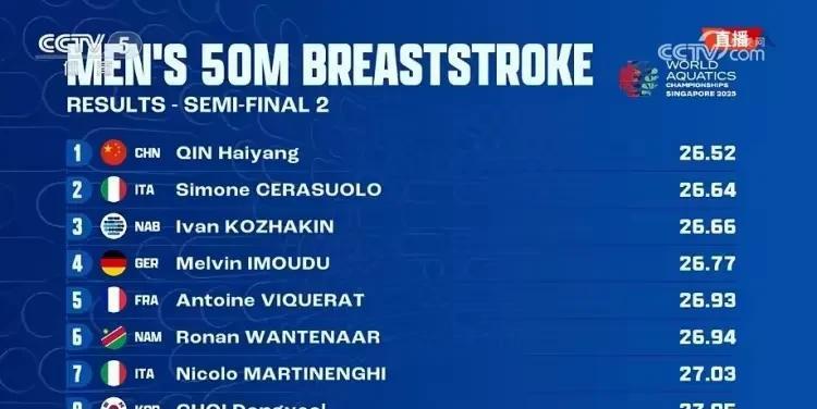 新加坡游泳世锦赛男子50米蛙泳半决赛,已经拿到100蛙冠军的覃海洋游出26秒52