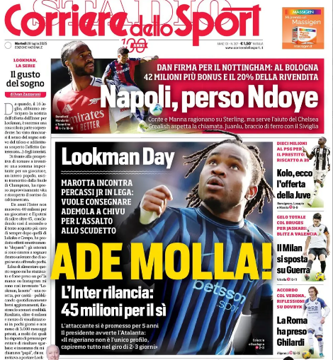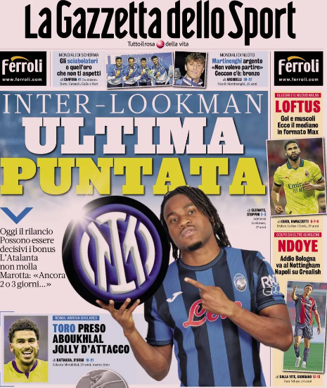 目前有一个问题,信源是《米兰体育报》、《罗马体育报》和《贝尔加莫邮报》。大意是说:国米之前和卢克曼之间达成了一致,敲定了一份年薪大约为4M-4.5M,为期5年的合同,这是国米运作卢克曼交易的最大资本。 然而,国米与球员的协议并不是无期限的,再过2-3,这种协议就可能会过期。 这也是昨天发布会上,马洛塔说“我们希望2-3天内完成交易,否则可能转向其他目标”的原因。