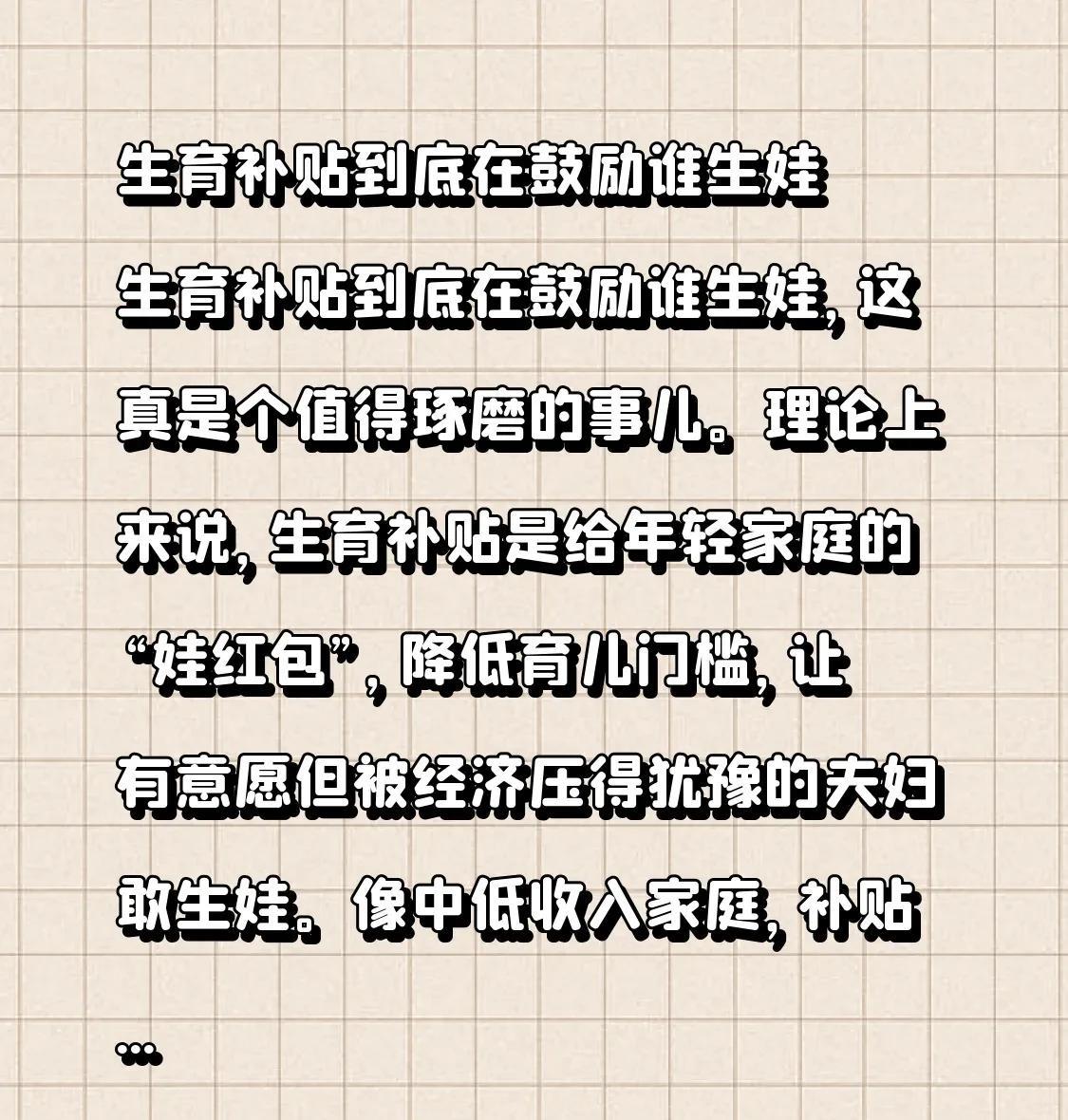 生育补贴到底在鼓励谁生娃生育补贴究竟在鼓励谁生娃呢?这可真是个值得深思的问题啊