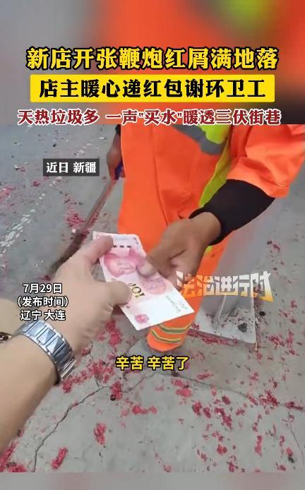“活该他发财!”7月27日,辽宁大连,男子为了庆祝新店开业,在门前放了许多鞭炮,地上散落着大量纸屑,由于周围只有一名环卫工,天又这么热,男子知道大叔打扫卫生不容易,就掏出100元让他买水。网友:这老板有格局! 大热天的,户外工作者真的都不容易,环卫工人们每天穿梭在大街小巷中,顶着烈日打扫卫生,而且他们的工资也不高,可以说非常的辛苦。 这天,刘先生的新店开业大吉,想着以后就靠这店养活一家老小了,刘先生的内心充满了激动,为了庆祝这个好日子,放几挂鞭自然是少不了的。 但庆祝过后,新的问题出现了,地上都是垃圾由谁来打扫? 其实环卫大叔早就来了,他站在一旁默默看着烟花,等到结束后立即拿着扫帚过来打扫。虽然大叔并没有说什么,但刘先生心里过意不去,走过去主动递给了大叔100元,让他去买瓶水喝。 虽然不多,但这也是刘先生的心意,让大叔也感觉到了温暖。 网友看后表示,这老板有格局,就冲他尊重每一位人的态度,日后一定能发大财! 大家对于这件事是怎么看? 信息来源:《新店开张鞭炮红屑满地落 店主暖心递红包谢环卫工 天热垃圾多 一声"买水"暖透三伏街巷》荔枝新闻