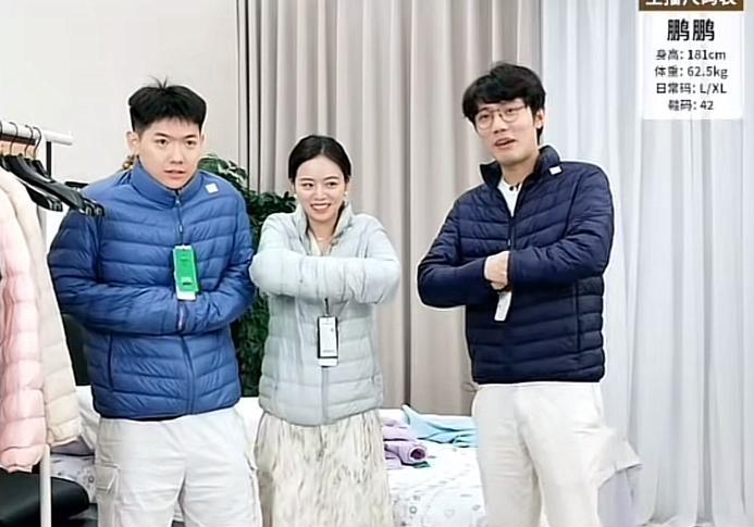 真不愧是三个主播一台戏, 鹏鹏、小贝和传熙三小只凑到一起都敢蛐蛐老板啦! 三人在讲到羽绒服时手插袖子里做出一副村口聊八卦的架势! 小贝:那个董姓小伙子,今年过年还回家吗? 传熙:今年过年回呀,该回还得回! 小贝:几个人回呀? 传熙:回来你就知道了! 小贝:到时候看看吧! 最厉害的还得是鹏鹏,很形象的演了一段!