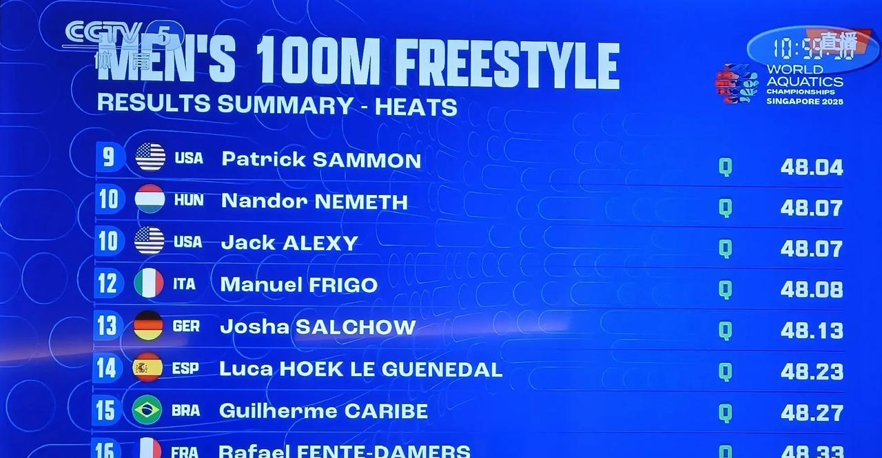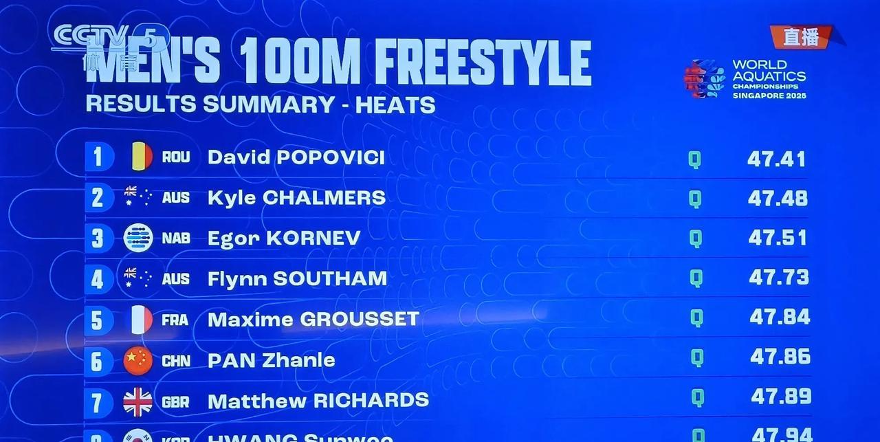 引入关注的新加坡游泳世锦赛男子100米自由泳预赛,潘展乐在最后一组游出47秒86