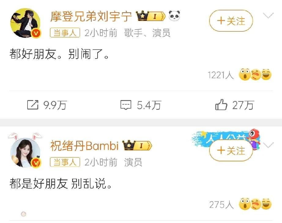 刘宇宁和祝绪丹传出恋情????如今已经辟谣!!! 小鱼觉得大概率是因为两人最近合作了新剧《书卷一梦》,剧中饰演的角色有感情纠葛,加上戏外互动被放大解读,自然就有人嗑CP了。 而且刘宇宁今年算霸屏了吧,连着几部戏,祝绪丹也刚录完《乘风破浪》,热度正高,难免会有人脑补点“因戏生情”的戏码。 小鱼觉得两人八竿子打不着,看看热闹就行,别太当真!