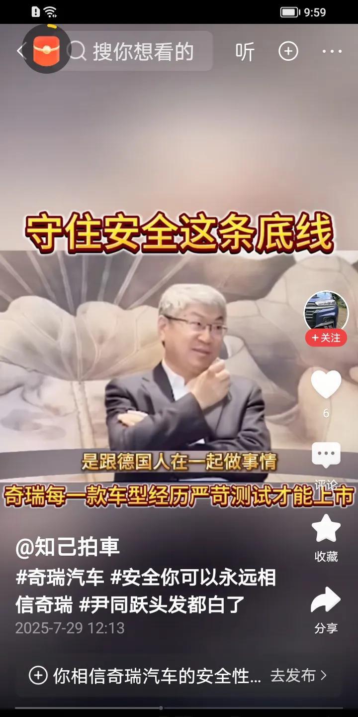 奇瑞汽车董事长尹同跃,不管置身于何种场合,都把汽车安全当作首要底线。对于汽车来说