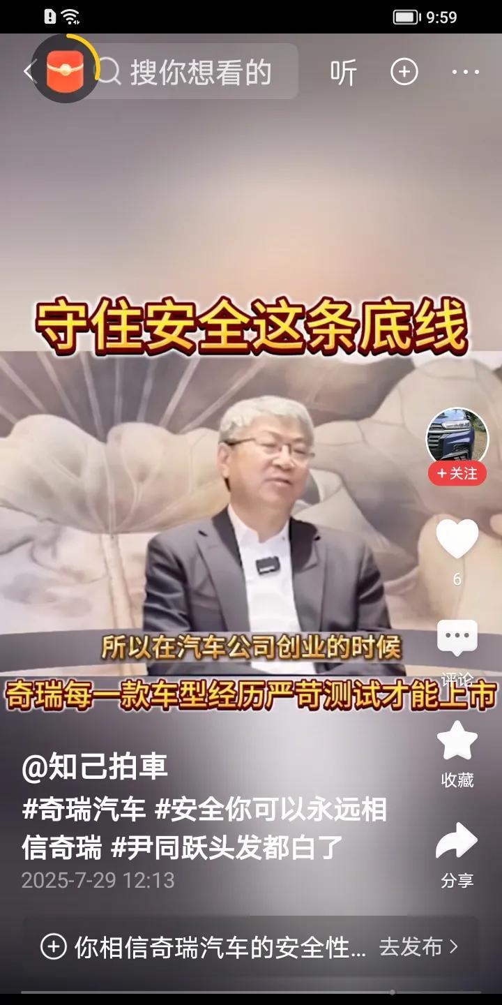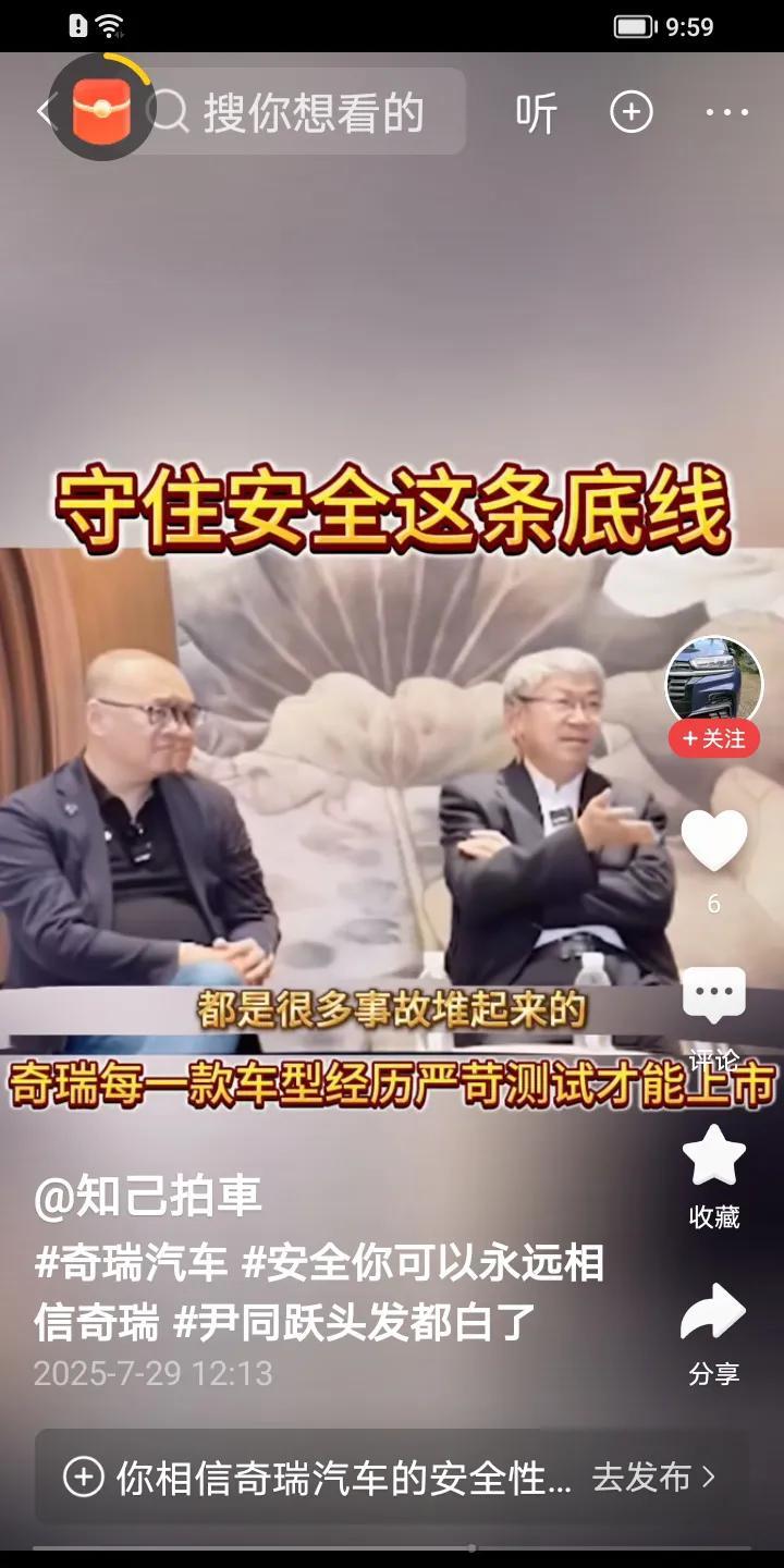 奇瑞汽车董事长尹同跃,不管置身于何种场合,都把汽车安全当作首要底线。对于汽车来说,安全是重中之重,不管汽车多么奢华、多么智能,要是存在安全隐患,那就是会被一票否决的产品。所以,他不论参与何种活动,都会用“奇瑞干得早,出活慢”来自我调侃奇瑞在汽车产业涉足的各个行业都起步较早,然而成果却比别人晚出。他多次强调要制造成熟、让广大消费者安心的产品。要是产品未能达标,就宁可推迟上市,这是为客户考虑,也是为品牌利益考虑。