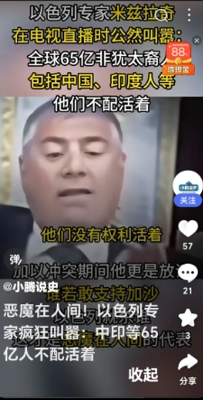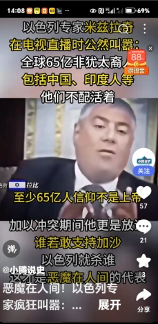 一以色列专家在电视台叫嚣:全球65亿非犹太裔人不配活着,包括中国人和印度人。谁支