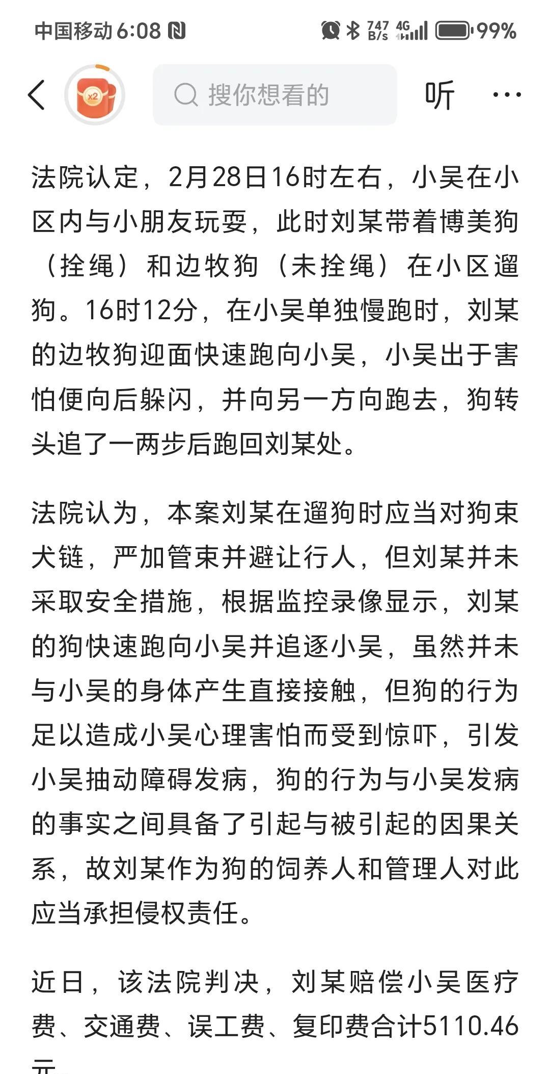 一个养狗人遛狗不牵绳,吓着小孩,沈阳沈北新区法院判决狗主人赔偿五千多元。 消息来自红星新闻。 狗主人辩称狗未与小孩接触,不应赔偿,然而法院则认为遛狗应该牵引狗链,不牵狗链是错误行为,狗接近小孩与小孩发病存在因果关系,理应赔偿。 遛狗牵绳,明文规定可是很多养狗人却总是置若罔闻,总觉得自己的狗温顺,不咬人。但是此案例告诉那些想当然的养狗人,狗不咬人,吓住人,也是可能赔钱的。这才五千多不算多,要是把老人,孕妇吓得摔倒了,那可有可能赔偿几万甚至更多,有可能需要卖房赔偿了。 有爱心的养狗人,为了你们的钱包,请牵引好狗链,避让老人小孩孕妇等弱势群体。