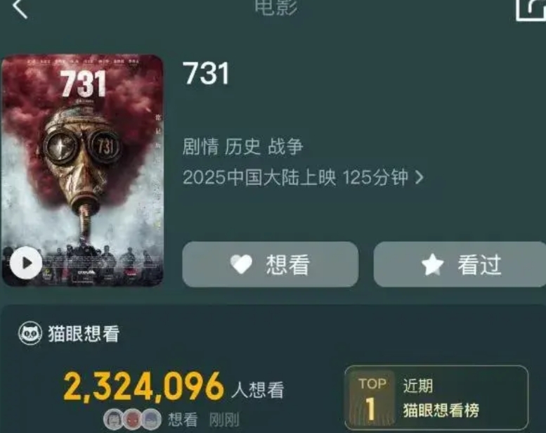 本来打算明天去看电影《731》的,来到支付宝订票,结果找了半天没找到,别的平台也订不到票,官网也从“2025年7月31日全球预映”变成“2025年中国大陆上映”,看来是真的推迟上映了,难道从暑期档改为国庆档了吗?