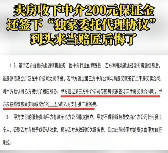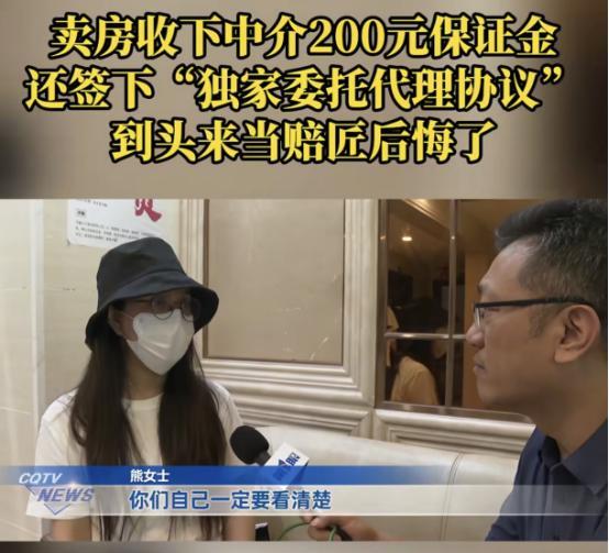 重庆,女子急着卖房,跟中介签了独家协议,对方给了她200元,作为保证金,女子觉得