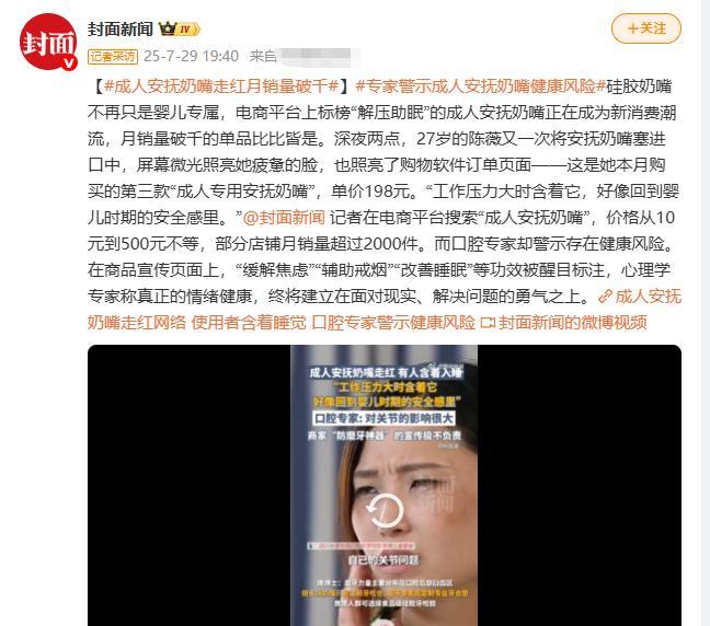 “太恶俗了!”27岁女子对成人安抚奶嘴上瘾,一月最少三只,价格10元-500元不等。她说现在很多年轻人都人手一只,吃到嘴里就像回到婴儿时期的安全感里。相比较婴儿,她们才更应该需要吃奶嘴来缓解压力..... 今年听到最离谱的一个单品就是“成人安抚奶嘴”了。原本安抚奶嘴的受众是情绪不稳定的婴幼儿,吸吮这个动作可以对婴儿造成安抚情绪的效果。可是万万没有想到,居然有一天,奶嘴居然能成为成年人的“解压神器”! 7月29日报道,27岁的陈女士在网上分享,说她就是安抚奶嘴上瘾。她的工作压力非常大,脑子每天都控制不住的在思考各种东西,这种情绪让她非常难受,直到在网上看到成人专用版安抚奶嘴。 原本陈女士也没有抱着很大的幻想,不过想着这估计和小年轻玩的“捏捏”是一个意思,就花了198元在网上下单了一个。可是没想到这一吃就吃上了瘾,就像有的人爱咬口腔黏膜、有人爱撕手上的倒刺一样。 吃奶嘴让陈女士可以忘记烦恼,冷静的思考一些问题。原本陈女士只在家吃,后来在公司压力大的时候都会含上,她说这样能让她“回到婴儿时期的安全感里。” 刚开始很多同事对她的这一行为都不理解,不过到后来陈女士向不少同事安利成功。原本以为陈女士不过是个例,可是上网搜寻了之后发现,成人安抚奶嘴可是有不少的消费者,绝大多数都是十几岁到三十岁左右的年轻人。 更令人匪夷所思的是,在一些女团的直播间中,C位的女领舞,穿着制服,然后嘴巴里就会含一个安抚奶嘴。再配上一些可爱的音乐,脸上在做些迷离的表情,又开始整“老幼瘦”审美那一套,这些直播间的流量往往都不低。 大部分的群众都是为了猎奇、新鲜感驻足的,但是也有些网友是真的喜欢,才每天守时观看的。在网上嗯那个擦回到承认安抚奶嘴价格从10元-500元不等,有些成人的安抚奶嘴,甚至开始出现内卷现象。比如找一些手工师进行“二创”,在奶嘴贴上钻石,贴纸,染色,蕾丝等等。 这几年里“老幼瘦”审美被网友们纷纷抵制,但是这就像雨后的春笋一样,死了一个,新的就会出现,禁止都进不完。作为一个成年人,最好的安抚就是工资。 成年人能够释放压力的方式有很多种,并不是只有擦边才能达到目的。这些人这么做不过就是为了流量,为了吸引更多的注意力去变现,根本不值得提倡。 并且专家也提醒了,成人长期使用奶嘴,会有可能导致牙齿变形,口腔肌肉出现疲劳等问题,对关节的影响非常大。情绪焦虑终将需要直面面对,而不是找这些就能解决根源的。 对此,你怎么看呢?欢迎在下方评论~
