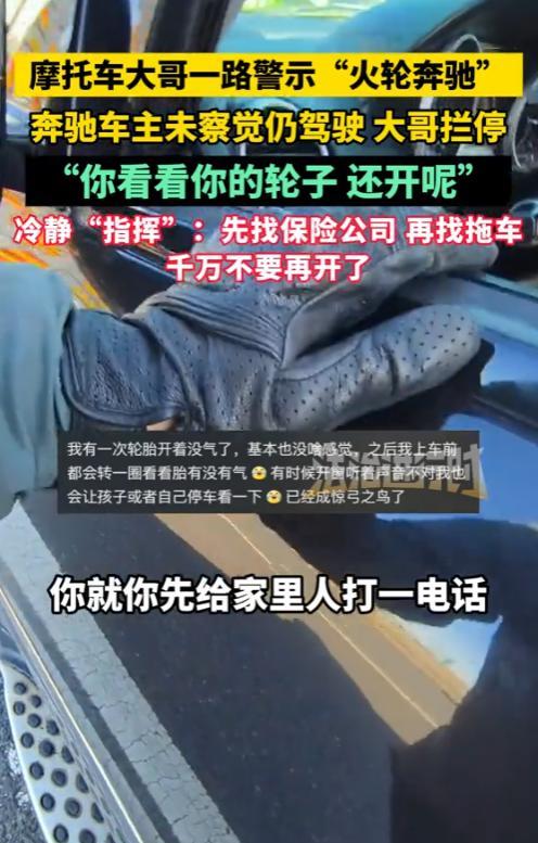 “太有人情味了!”7月29日,河北,一女子在路上开着奔驰车,被一摩托车大哥拦停,原来,女子的车轮破裂,她没有发现,大哥是为了车主的安全,拦停后,还冷静指挥女子:先找保险公司,再找拖车,千万不要开了!网友:幸好遇到大哥! 当天,太阳正毒,这位女司机开着辆奔驰,稳稳当当地在快车道上走,一路上还跟着收音机里的歌轻轻晃着头,压根没注意到车出了啥问题,这时候,后面来了个骑摩托车的大哥。 他戴着顶旧头盔,黝黑的胳膊上全是汗珠,他一开始在慢车道,眼瞅着前面奔驰车的左前胎不太对劲,那轮胎侧面裂了老大个口子,气都快漏完了,轮圈都快磨到地面了,看着就吓人。 大哥赶紧拧了拧油门,慢慢跟到奔驰旁边,使劲摆手想让女司机停车,可女司机以为是有人想碰瓷,还往旁边打了点方向盘,想躲开他,这时候大哥也急了,他赶紧加速冲到奔驰前面,稳稳停在车头前面。 女司机这才踩了刹车,大哥把车停好,就回去找女子,指着她的后胎说:“你看你那车胎,裂了个大口子,再开下去非出事不可”,女司机这才知道,吓得脸都白,侧面的裂纹跟张开的嘴似的。 她刚才车有点晃悠不是错觉,真是轮胎出问题了,大哥反倒镇定下来,跟她说:“你先别急,现在赶紧打保险公司电话,让他们派拖车来,千万不能再开了,这胎随时可能炸,太危险。” 等拖车的时候,女司机一个劲给大哥道谢,不得不说,现在肯多管事的人不多了,这大哥心善,有人说:“幸好遇到他,不然爆胎可不是闹着玩的。” 其实啊,这世上还是好人多,有时候路上遇到点事,伸把手帮个忙,可能就帮别人躲过了大麻烦,就像这位大哥,骑着摩托车,冒着热气,也要提醒素不相识的人,这份心,比啥都金贵。 信息来源:《摩托车大哥一路警示“火轮奔驰”奔驰车主未察觉仍驾驶 大哥拦停“你看看你的轮子还开呢”》法治进行时