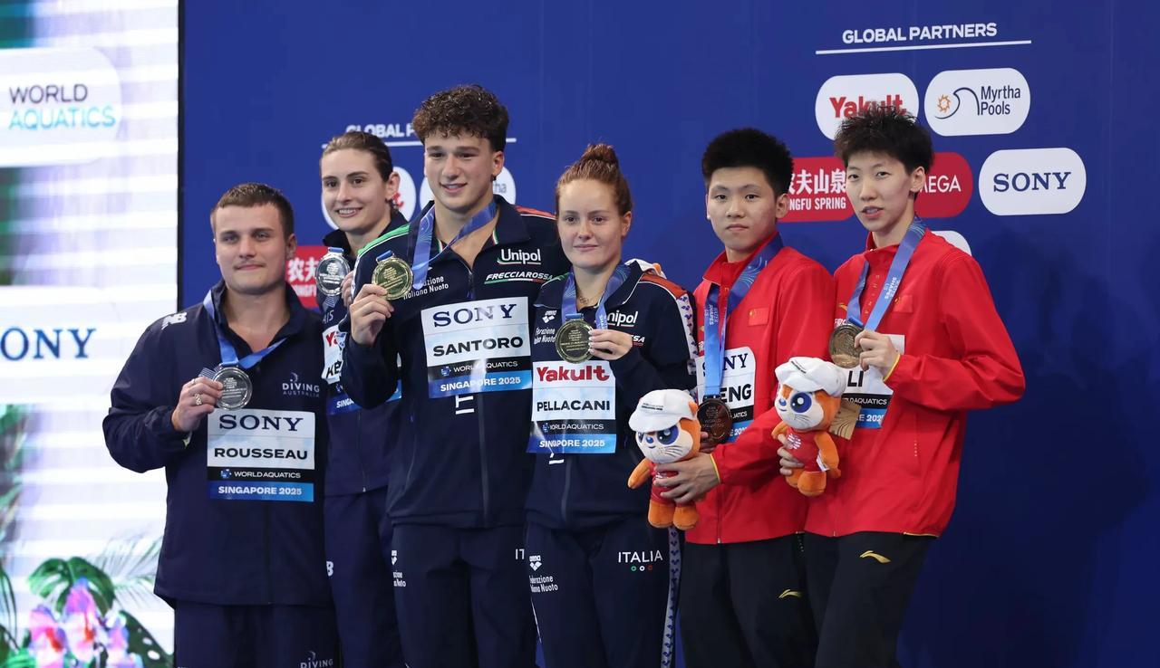 新加坡游泳世锦赛跳水项目继续进行,中国队又丢掉一枚金牌,在混合双人3米板决赛中,中国队派出已拿到女子1米板亚军的李亚杰、拿到混合团体和男子双人10米台两项冠军的程子龙搭档出战,最终两人收获季军,意大利组合佩拉卡尼/圣托罗夺冠,澳大利亚组合基尼/鲁索获得亚军,前三名的分数分别是308.13分、307.25分、305.70分,非常接近,胜负就在毫厘之间。