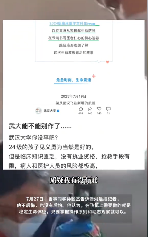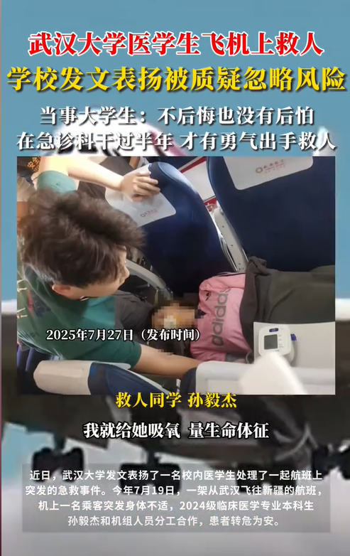 湖北武汉,一名大学生在乘坐前往新疆的飞机上,突然听到广播在喊着需要医生,有一位乘客身体出现了不适。该学生自告奋勇前往,并紧急对乘客进行救助使其转危为安。然而此事曝光后,不少网友质疑:他没有行医资格证,这属于违法行医。 据潇湘晨报7月27日报道,在湖北武汉飞往新疆的航班上,广播突然打破了平稳飞行的宁静,“紧急寻找医生,有乘客身体不适!” 此时,2024 级临床医学专业本科生孙毅杰坐在座位上,心跳瞬间加快。他的脑海里,闪过在急诊科跟导师实习半年的场景,那些抢救重症患者和监测生命体征的画面,像电影片段一样快速放映。没有丝毫犹豫,他起身走向发病乘客,一场云端救援悄然展开。 孙毅杰实习完后,和朋友打算去新疆游玩,俩人早早地收拾好行李,踏上了飞机,一路上,孙毅杰和朋友都在自己座位上眯着,想着养精蓄锐,等到地方了就开始好好游玩,可这时广播声响起。 飞机客舱的过道不算宽敞,孙毅杰挤过去时,看到发病乘客面色苍白,呼吸也有些微弱。他迅速回忆起在急诊科学到的急救流程,先给患者吸氧,接着小心翼翼地测量生命体征。 每一个动作,他都尽量做得稳当,因为他知道,此刻乘客的安危就系在这些操作上。机组人员也在一旁配合,递仪器然后维持秩序,客舱里的紧张气氛,被孙毅杰沉稳的动作稍稍安抚。 幸运的是,经过一番救助,乘客的状况逐渐稳定,转危为安。飞机落地后,乘客被顺利送往医院,这场云端急救,本是充满善意与温暖的故事开端。 可谁也没想到,事情曝光后,网上掀起了一阵争议。不少网友跳出来质疑:“他一个还没毕业的学生,没有行医资格证,这算不算违法行医?” 这些质疑声一下子把孙毅杰推到了舆论风口。 还有人说 “没有证就不该出手,出了问题谁负责”,质疑学校表扬的动机,觉得鼓励这样的行为会带来风险。 孙毅杰表示其实有自己的底气。他刚入学不久,就跟着急诊科导师学习,今年 1 月还在急诊科实习了半年。那些日子里,他见过太多危急状况,也学会了如何判断生命体征而且进行基础急救。 所以在飞机上,他才敢站出来。他事后说,当时没想那么多,只觉得该用学到的知识救人,不后悔也没后怕。可网友的质疑,还是让这件事变得复杂起来。 这件事其实也让大家看到了很多层面的问题。从法律角度看,无证行医确实是条红线,但在紧急情况下,像飞机上这种孤立无援而且患者生命垂危的场景,专业学生出手救助,到底该怎么界定? 孙毅杰不是盲目施救,他有专业学习和实习的基础,用的是基础急救手段,目的是救人,而非行医盈利或违规操作。 最后,这事您怎么看?欢迎在评论区留言,与大家一起交流您的看法! 信息来源:潇湘晨报