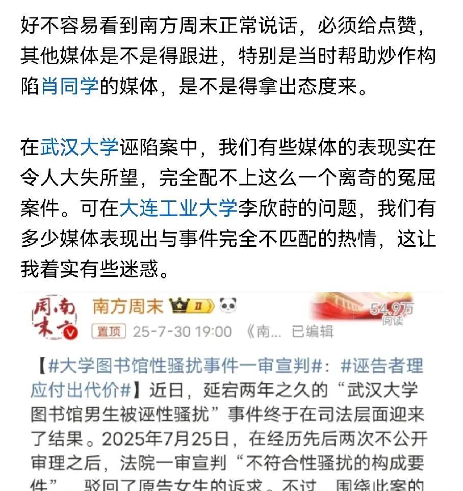 我就不明白武大装聋作哑,司法也不管吗?既然明确肖同学是被冤枉的,要求武大和杨某为其恢复名誉应该是最基本的操作吧。在社会热点事件和大是大非面前,司法的犹疑迟钝只会引发公众不满情绪的发酵,也给了别有用心的那部分人推波助澜的机会