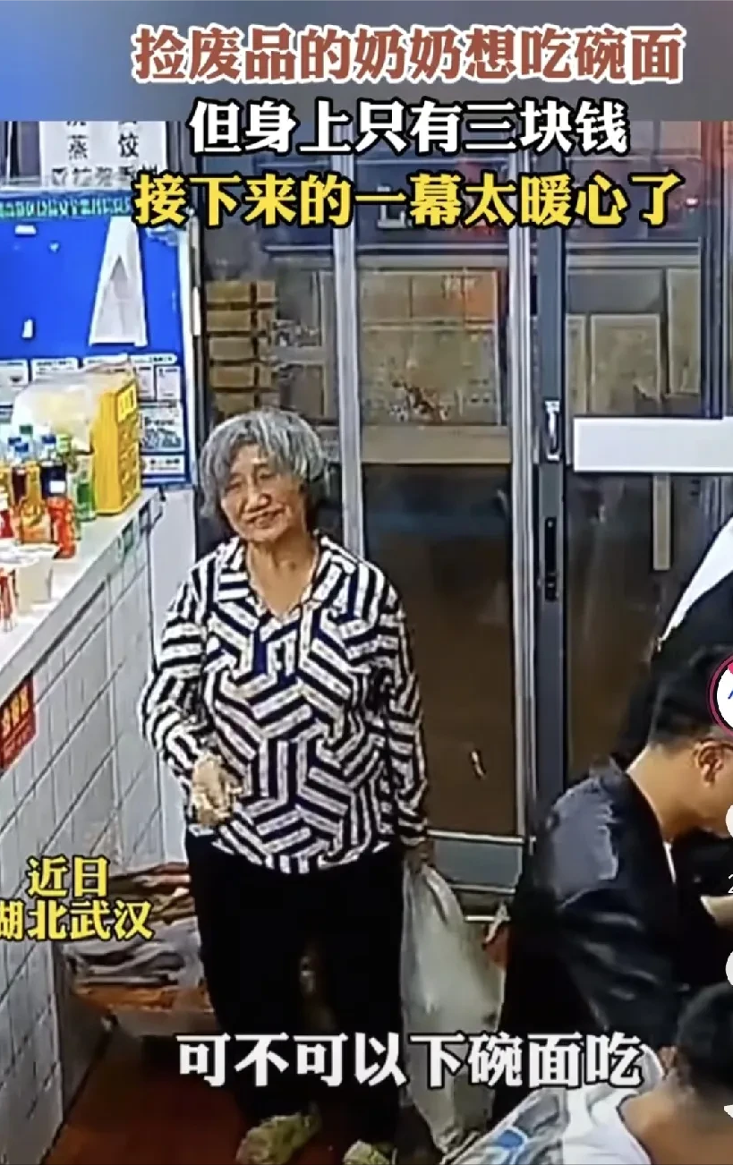 近日,在湖北武汉,一位拾荒老人走进了一家面馆,手中攥着3元钱,想吃一碗面,老板却毫无反应,万万没想到,旁边小伙子的反应实在是令人动容。