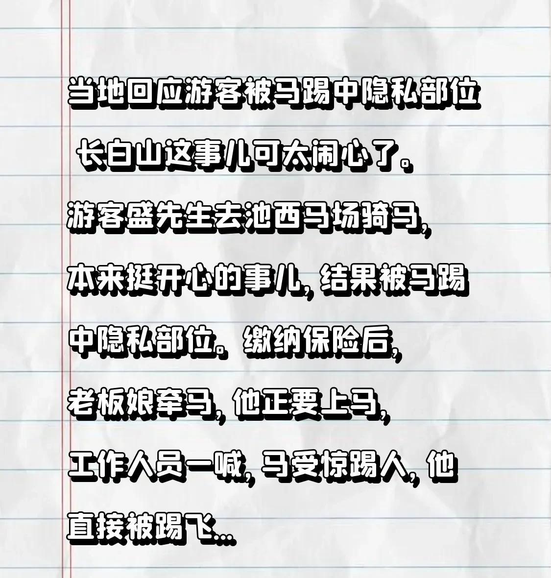 当地回应游客被马踢中隐私部位长白山这事儿可太闹心了。游客盛先生去池西马场骑马,